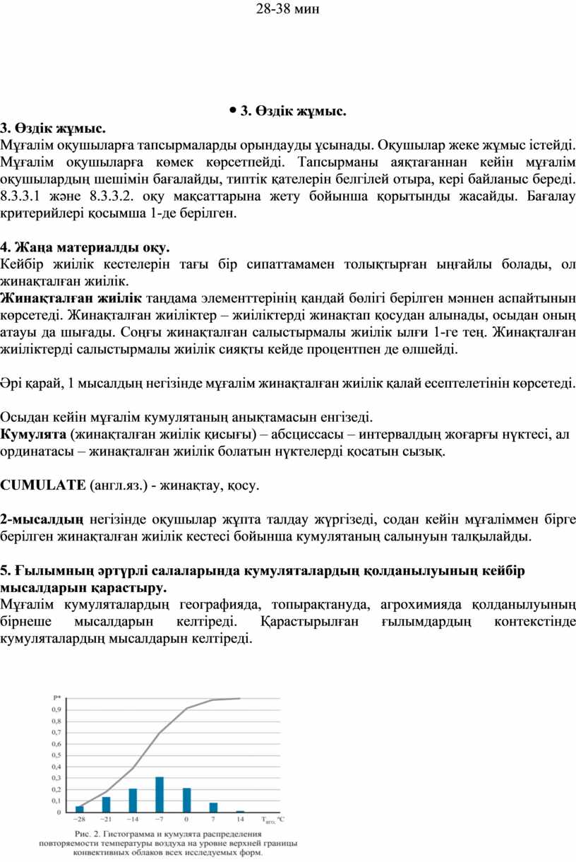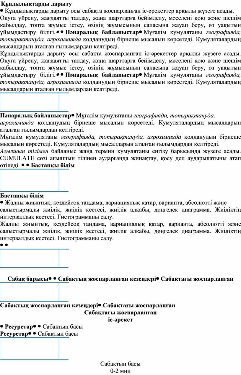 6. Өткен материалды бекіту. Оқушыларға жеке жұмыс үшін тапсырмалар беріледі. Мұғалім оқушылардың тапсырманы орындауын бақылайды, қажеттілігінше оларға сұрақ қояды, дұрыс шешімге бағыттайды, консультациялық көмек көрсетеді, оқушыларға кері байланыс береді. Тапсырмаларды орындағаннан кейін оқушылар мұғаліммен бірге қорытынды жасайды. Мұғалім дұрыс орындалған тапсырмаларды көрсетеді, оқушылар өзін-өзі бағалауда іске асырады. Бағалау критерийлері Оқушы ü Статистикалық кесте бойынша жинақталған жиілікті дұрыс табады; ü Жинақталған жиіліктің статистикалық кестесі бойынша кумулятаны дұрыс салады; ü Берілген кумулята қисығы бойынша жинақталған жиіліктің статистикалық кестесін дұрыс құрастырады. |