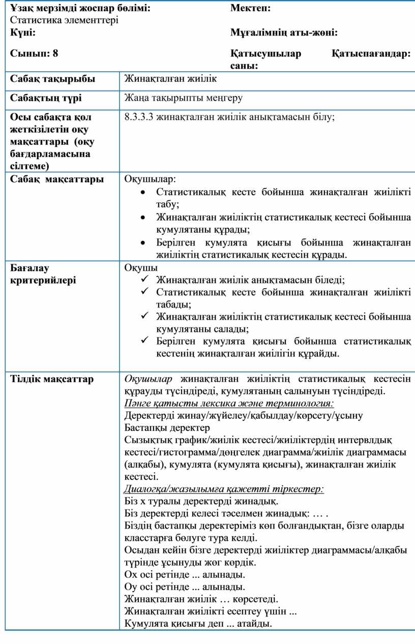 Оқушылар жинақталған жиіліктің статистикалық кестесін құрауды түсіндіреді, кумулятаның салынуын түсіндіреді. Пәнге қатысты лексика және терминология: Деректерді жинау/жүйелеу/қабылдау/көрсету/ұсыну Бастапқы деректер Сызықтық график/жиілік кестесі/жиіліктердің интервлдық кестесі/гистограмма/дөңгелек диаграмма/жиілік диаграммасы (алқабы), кумулята (кумулята қисығы), жинақталған жиілік кестесі. Диалогқа/жазылымға қажетті тіркестер: Біз х туралы деректерді жинадық. Біз деректерді келесі тәселмен жинадық: … . Біздің бастапқы деректеріміз көп болғандықтан, бізге оларды класстарға бөлуге тура келді. Осыдан кейін бізге деректерді жиіліктер диаграммасы/алқабы түрінде ұсынуды жөг көрдік. Ох осі ретінде ... алынады. Оу осі ретінде ... алынады. Жинақталған жиілік … көрсетеді. Жинақталған жиілікті есептеу үшін ... Кумулята қисығы деп ... атайды. |