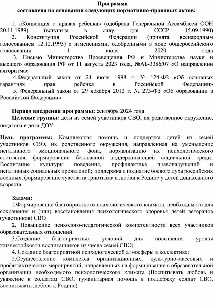 специальной военной операции (в дальнейшем СВО) составлена программа