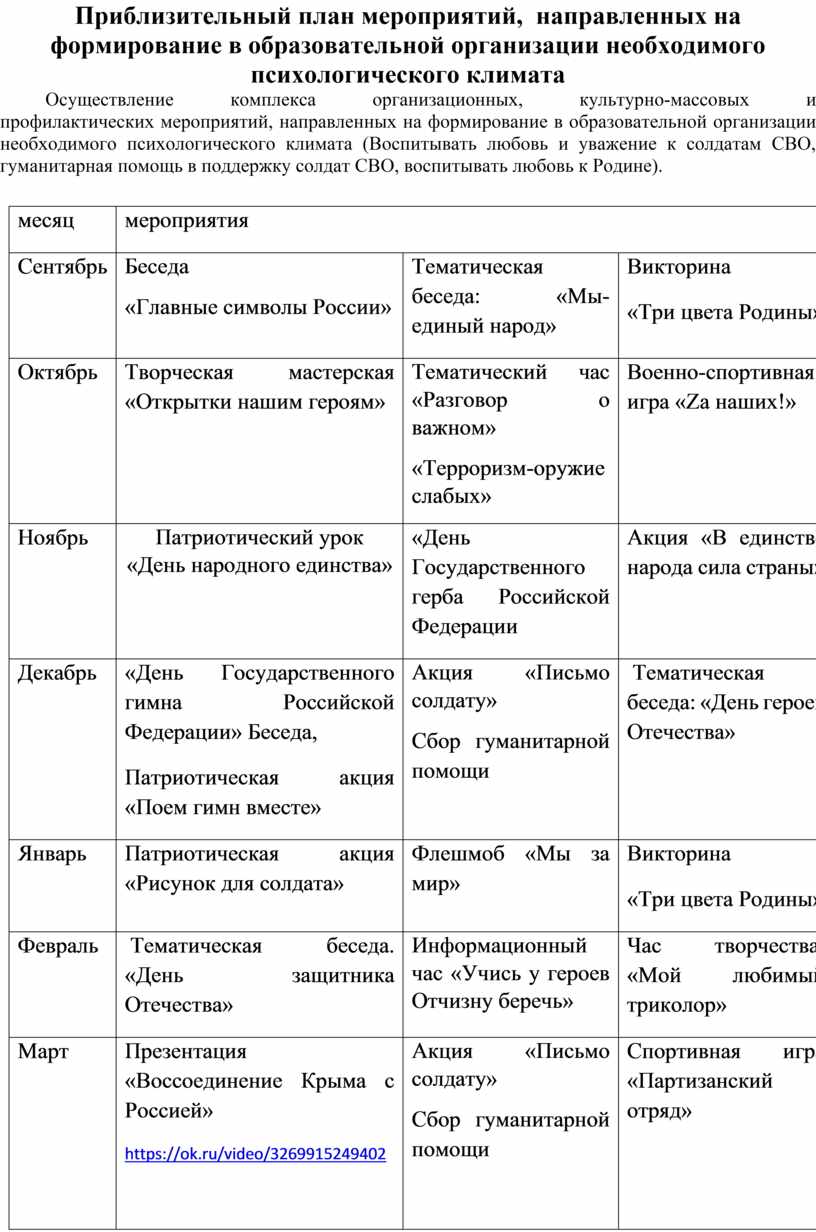 Приблизительный план мероприятий, направленных на формирование в образовательной организации необходимого психологического климата