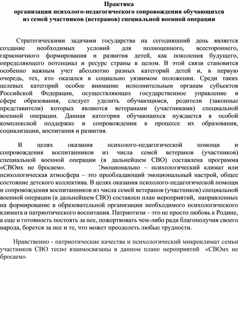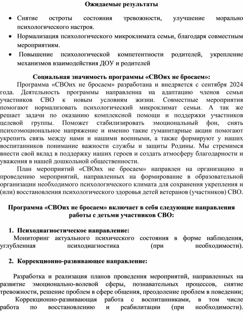 План мероприятий «СВОих не бросаем» направлен на организацию и проведению мероприятий, направленных на формирование в образовательной организации необходимого психологического климата для сохранения укрепления и (или) восстановления психологического здоровья детей ветеранов (участников) СВО.
