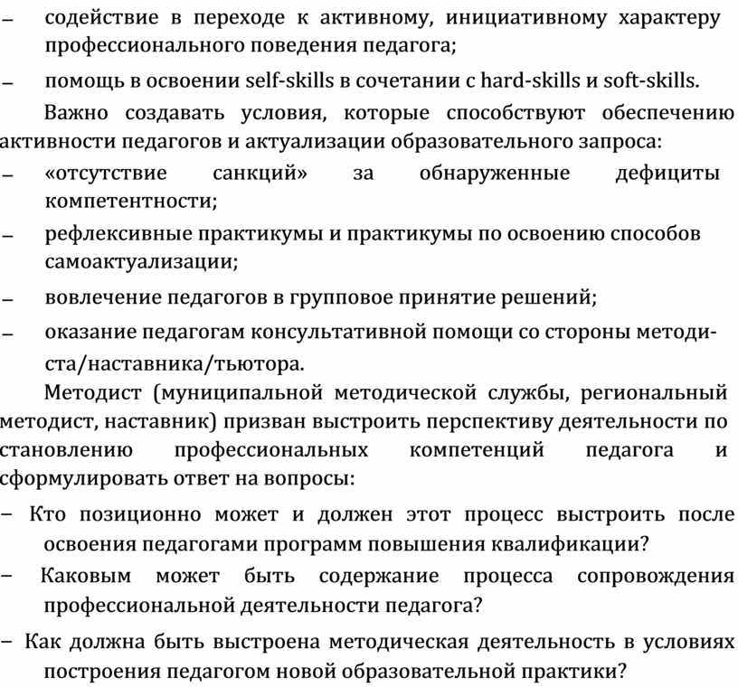 Методист (муниципальной методической службы, региональный методист, наставник) призван выстроить перспективу деятельности по становлению профессиональных компетенций педагога и сформулировать ответ на вопросы: