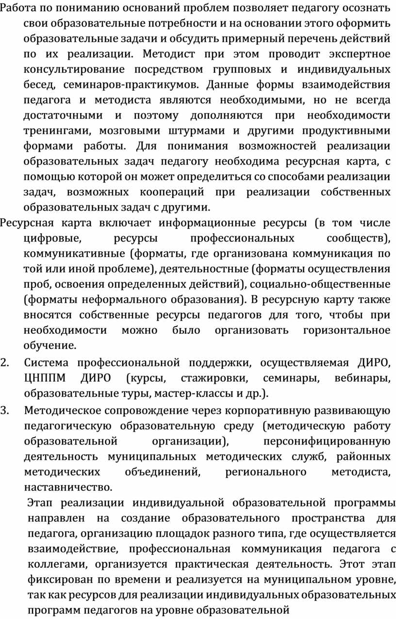 Этап реализации индивидуальной образовательной программы направлен на создание образовательного пространства для педагога, организацию площадок разного типа, где осуществляется взаимодействие, профессиональная коммуникация педагога с коллегами, организуется практическая деятельность. Этот этап фиксирован по времени и реализуется на муниципальном уровне, так как ресурсов для реализации индивидуальных образовательных программ педагогов на уровне образовательной организации недостаточно. На данном этапе могут формироваться разные типы групп (проблемные, творческие, проектные и т.п.) в зависимости от того, в каком содержании образования и способах работы нуждаются педагоги. По формам это могут быть круглые столы по обсуждению проблем, стажировки, коуч-сессии, тренинги, фасилитационные сессии, индивидуальные и групповые консультации. Методист при этом актуализирует образовательные задачи, предлагает варианты их решения, организует взаимодействия педагогов.