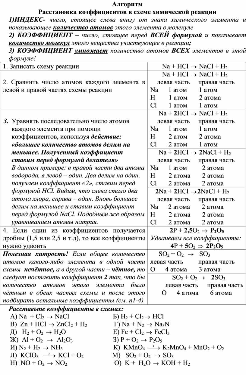 2) КОЭФФИЦИЕНТ – число, стоящее перед ВСЕЙ формулой и показывает количество молекул этого вещества участвующее в реакции;