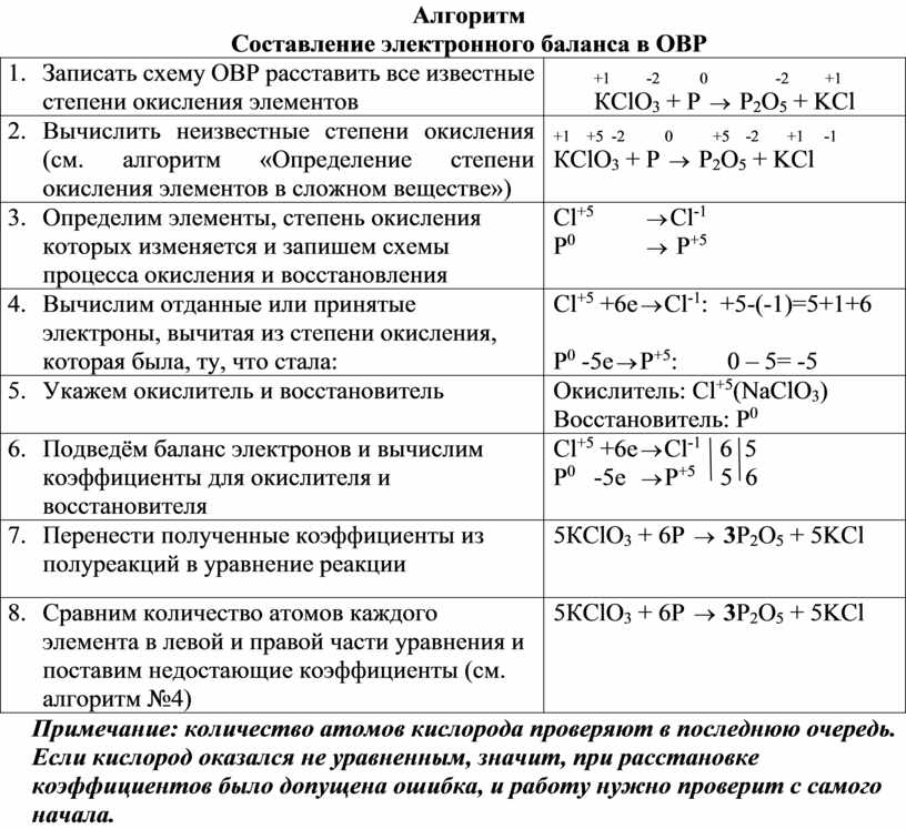 Примечание: количество атомов кислорода проверяют в последнюю очередь. Если кислород оказался не уравненным, значит, при расстановке коэффициентов было допущена ошибка, и работу нужно проверит с самого начала.