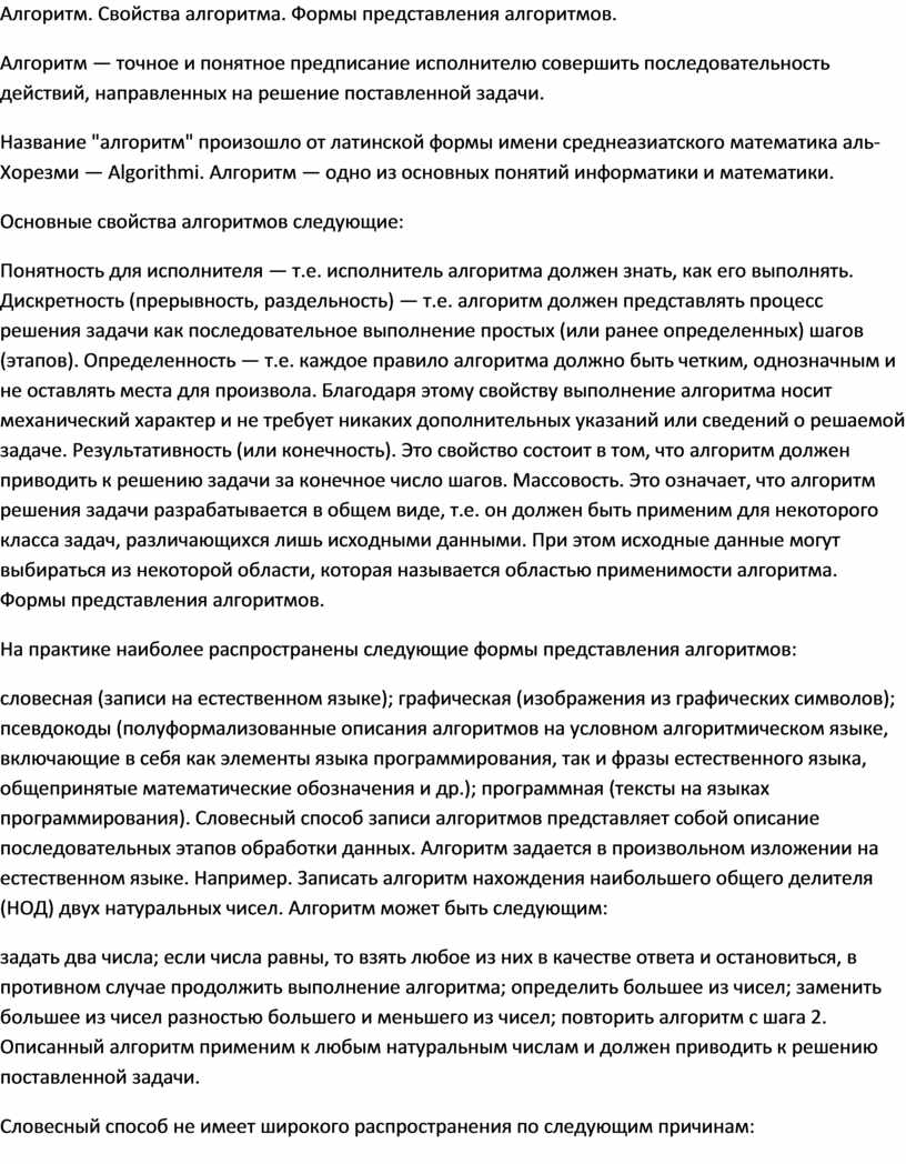 Алгоритм. Свойства алгоритма. Формы представления алгоритмов.