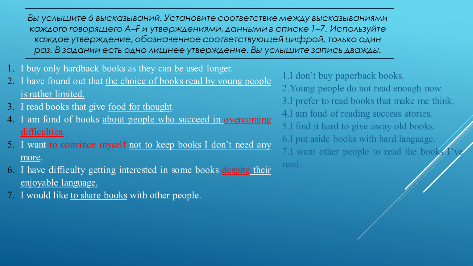 До первого прослушивания прочитайте все утверждения 1-7. Подчеркните в них ключевые слова. Ищите различия, думайте, чем эти утверждения отличаются друг от друга, так как, как правило, они тематически близки между собой.