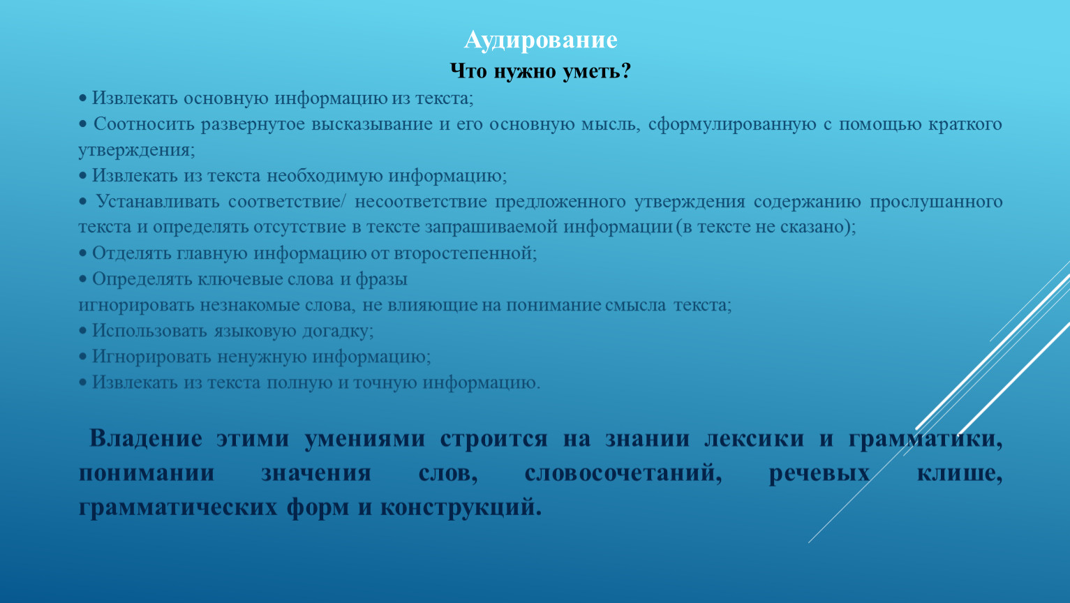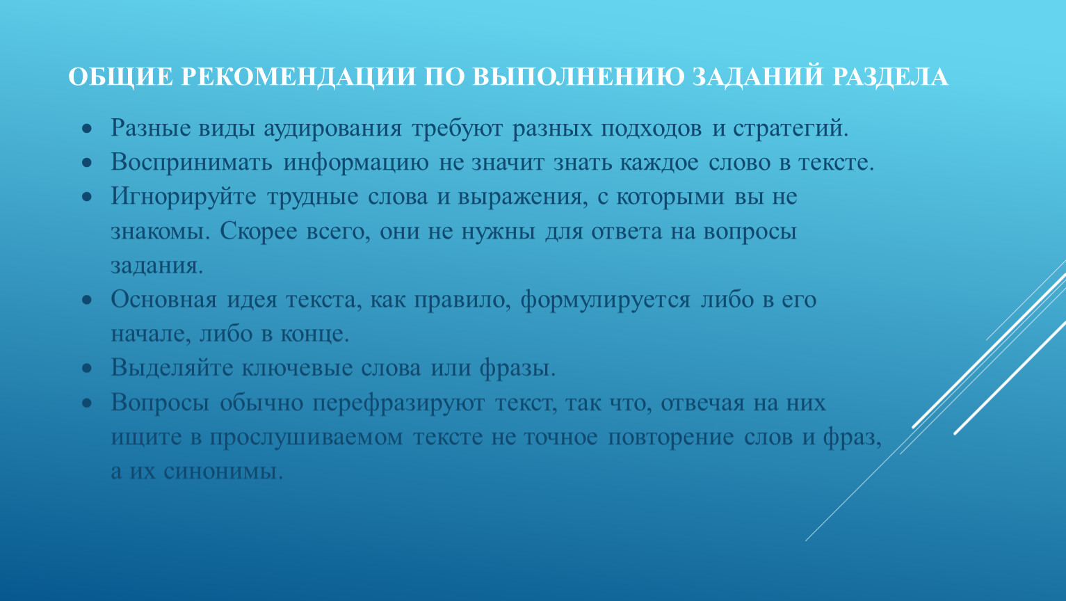Разные виды аудирования требуют разных подходов и стратегий.