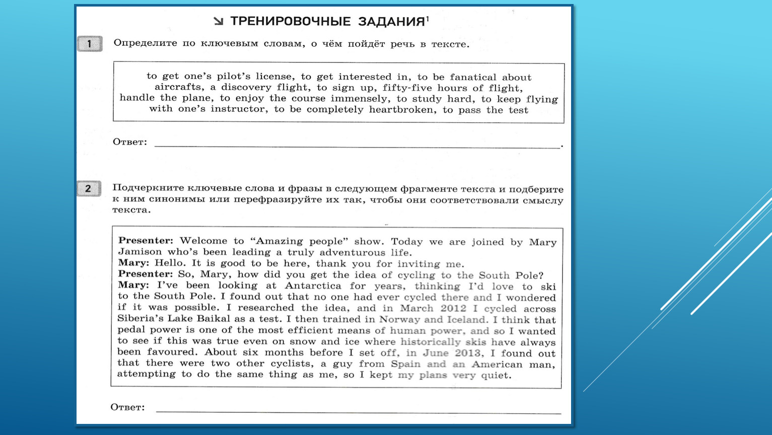 Игнорируйте трудные слова и выражения, с которыми вы не знакомы. Скорее всего, они не нужны для ответа на вопросы задания.