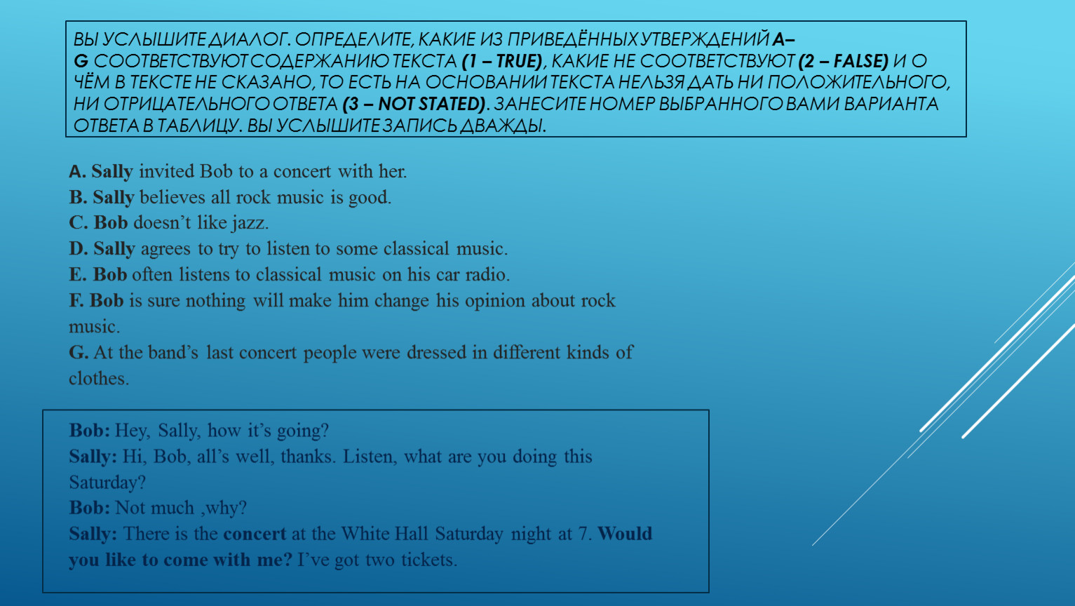 A. Sally invited Bob to a concert with her.B. Sally believes all rock music is good.C. Bob doesn’t like jazz.D. Sally agrees to try to listen to some classical music.E. Bob often listens to classical music on his car radio.F. Bob is sure nothing will make him change his opinion about rock music.G. At the band’s last concert people were dressed in different kinds of clothes.