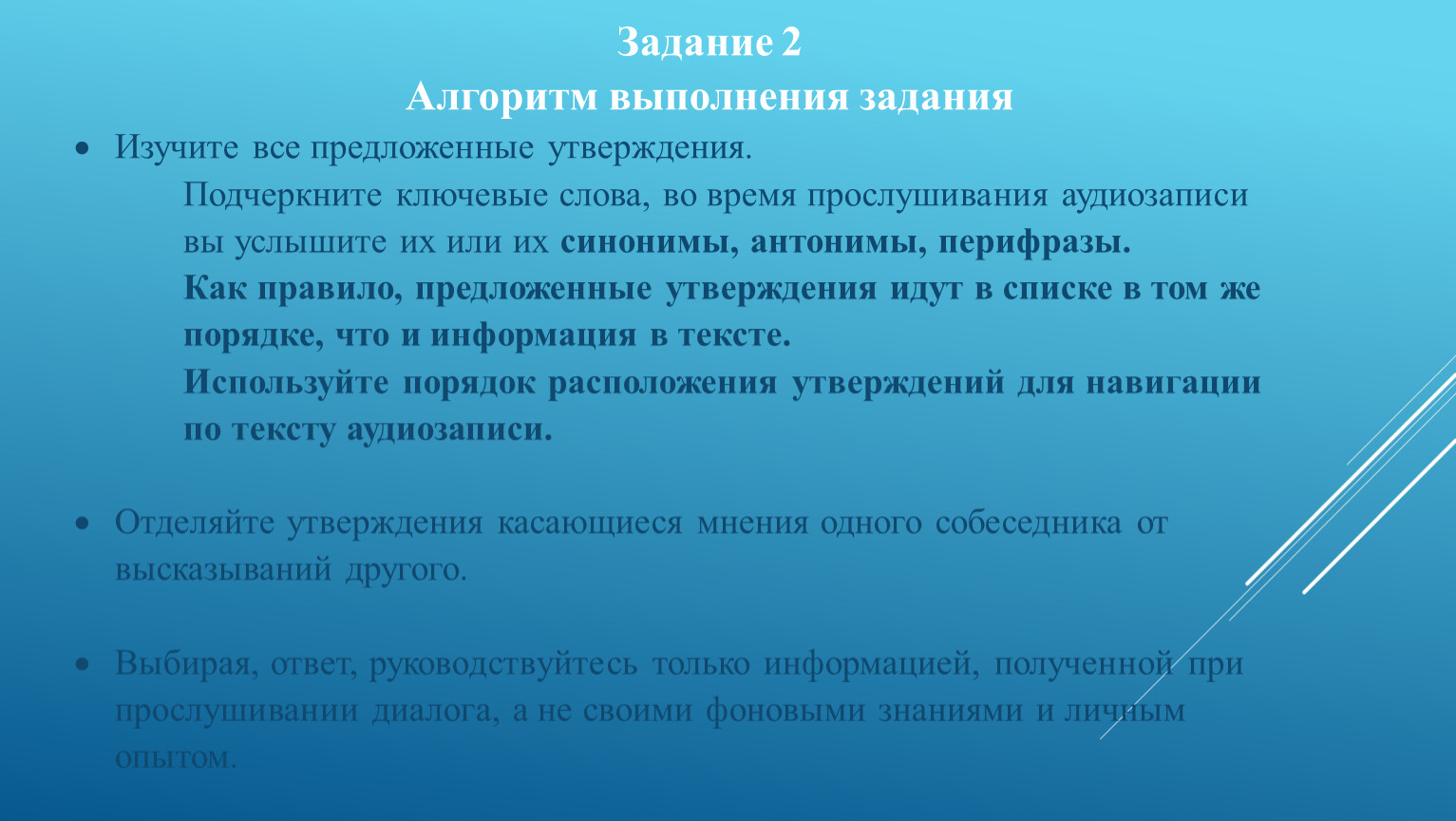 Подчеркните ключевые слова, во время прослушивания аудиозаписи вы услышите их или их синонимы, антонимы, перифразы.