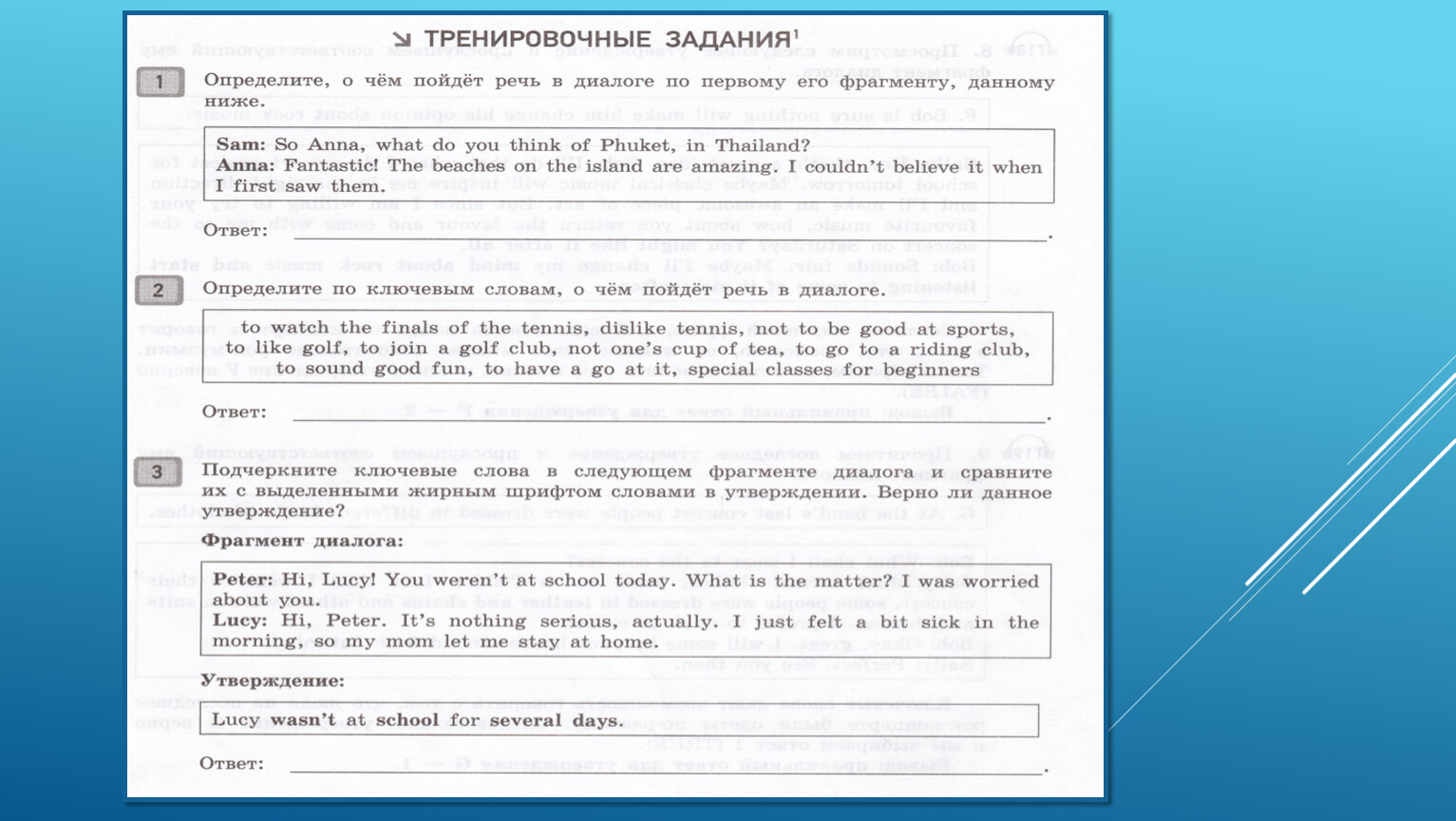 В данном задании не требуется полного понимания аудиозаписи, поэтому надо стараться понять основное содержание по ключевым словам.