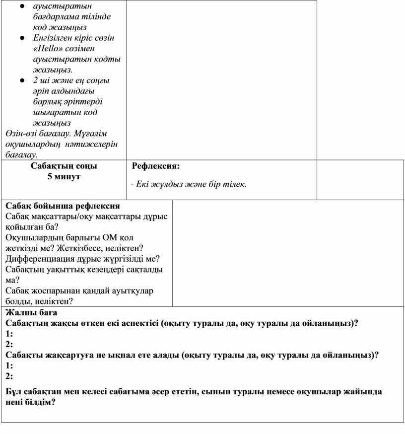 Сабақ бойынша рефлексия Сабақ мақсаттары/оқу мақсаттары дұрыс қойылған ба? Оқушылардың барлығы ОМ қол жеткізді ме? Жеткізбесе, неліктен? Дифференциация дұрыс жүргізілді ме? Сабақтың уақыттық кезеңдері сақталды ма? Сабақ жоспарынан қандай ауытқулар болды, неліктен? |