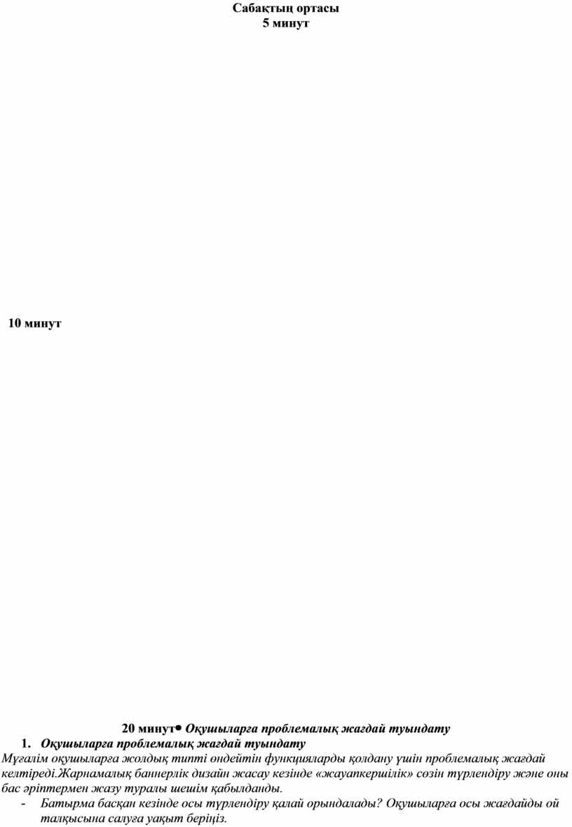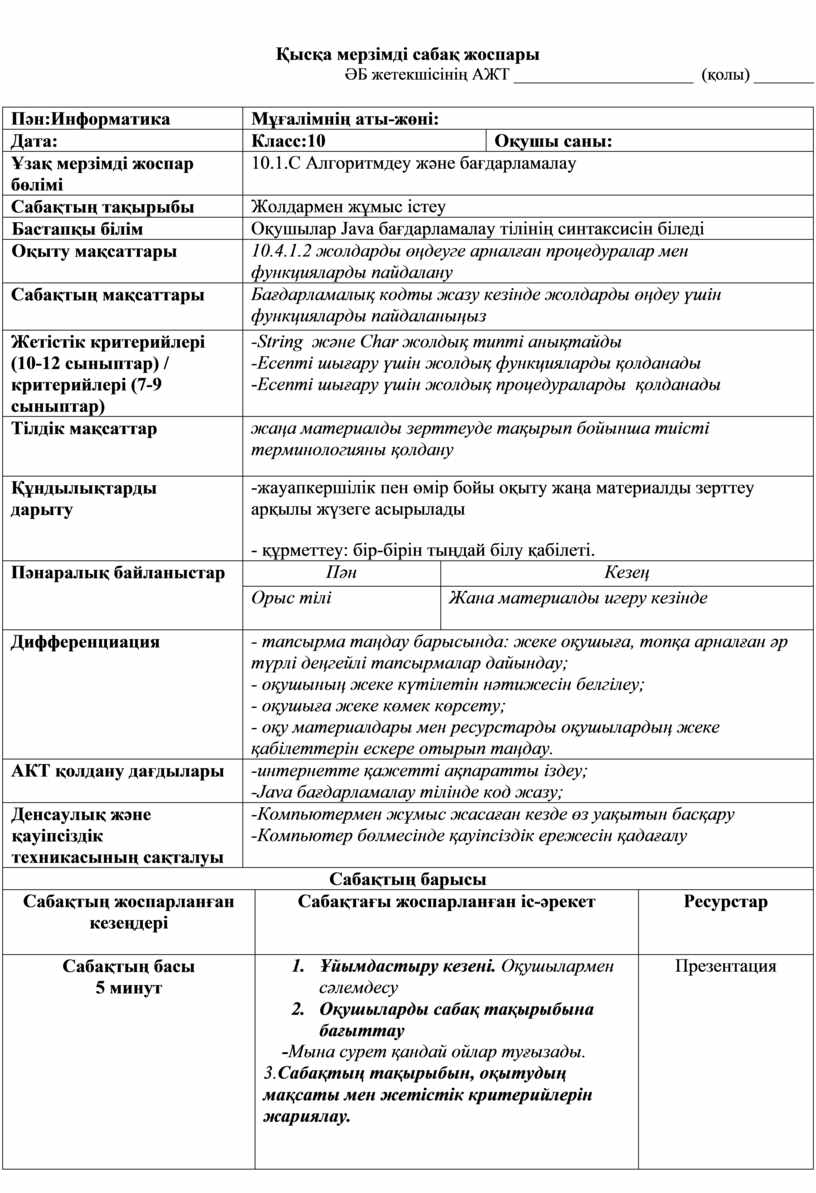 Мұғалім оқушыларға жолдық типті өндейтін функцияларды қолдану үшін проблемалық жағдай келтіреді.Жарнамалық баннерлік дизайн жасау кезінде «жауапкершілік» сөзін түрлендіру және оны бас әріптермен жазу туралы шешім қабылданды. - Батырма басқан кезінде осы түрлендіру қалай орындалады? Оқушыларға осы жағдайды ой талқысына салуға уақыт беріңіз. Оқушылар әр түрлі шешу жолдарын айту мүмкін.Мысалға сөздегі әр әріпті үлкен әріптерге бір бірден ауыстыру. Мұғалім Java-ғы UpperCase () функциясының жұмысын көрсетеді. Мұғалім қорытынды жасайды кез-келген қолданбалы бағдарлама үшін бағдарлама коды жұмыс жасайды. 2. Жаңа материалды зерттеу Мұғалім жолдық типтегі ақпаратты өңдеу үшін Java бағдарламалау тілінің негізгі функцияларын көрсетеді және 3 шағын топтық жұмысын ұйымдастырады. Оқушылар төмендегі дескрипторлар бойынша тақырыбын қорғайды және бағалайды: - Жолдық типтік функцияның синтаксисі, - Осы функциялардың колдану мысалын көрсету