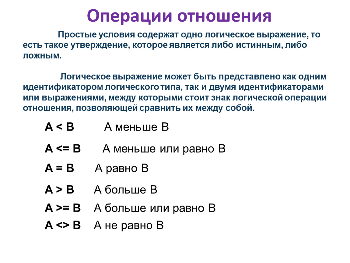 Логическое выражение может быть представлено как одним идентификатором логического типа, так и двумя идентификаторами или выражениями, между которыми стоит знак логической операции отношения, позволяющей сравнить их между собой.