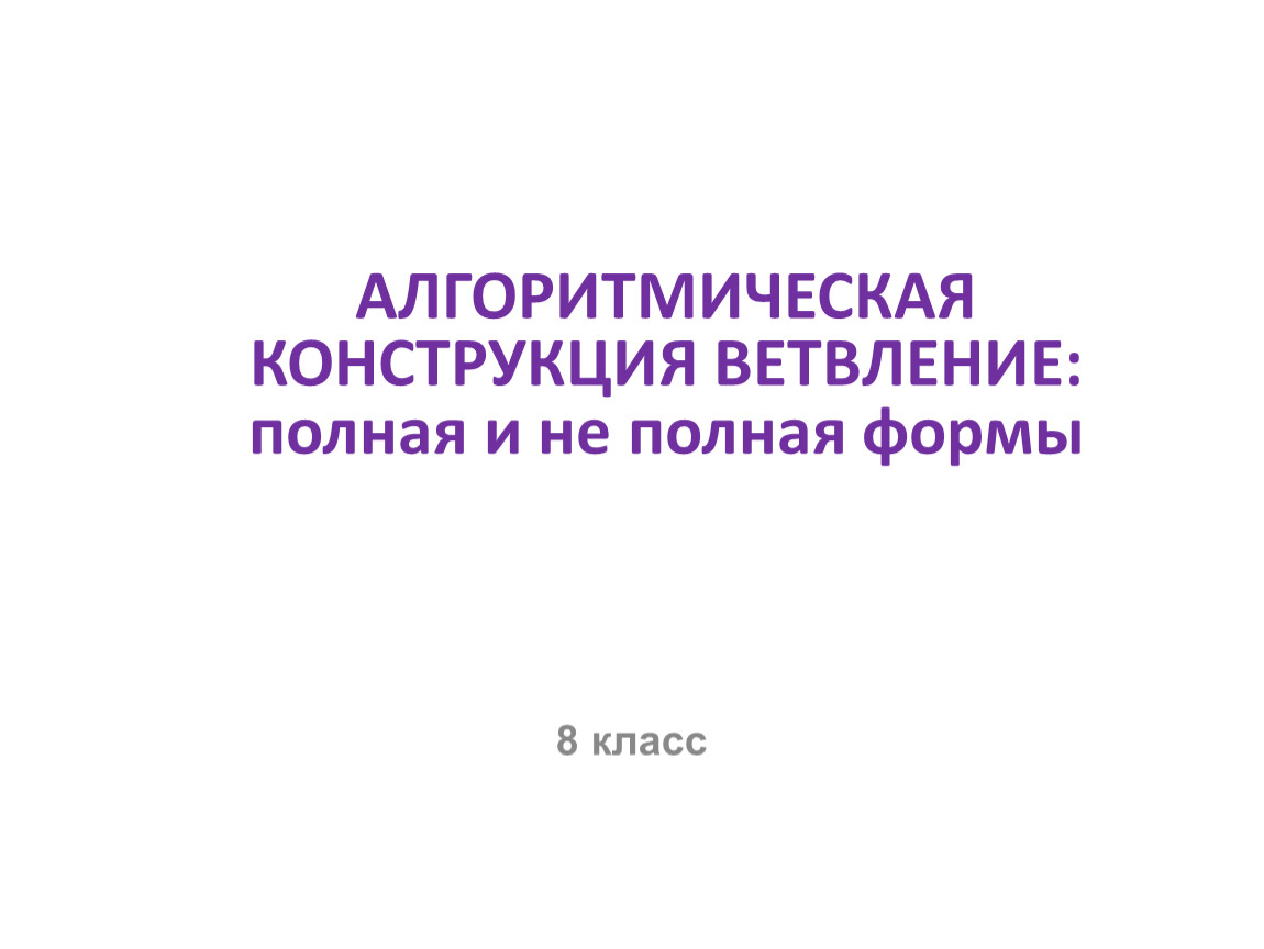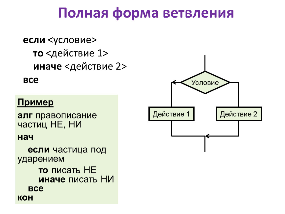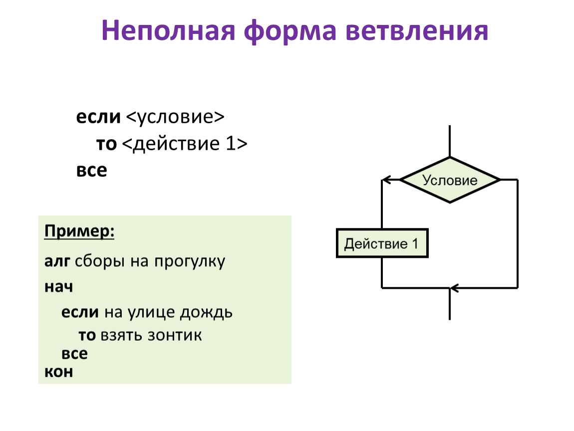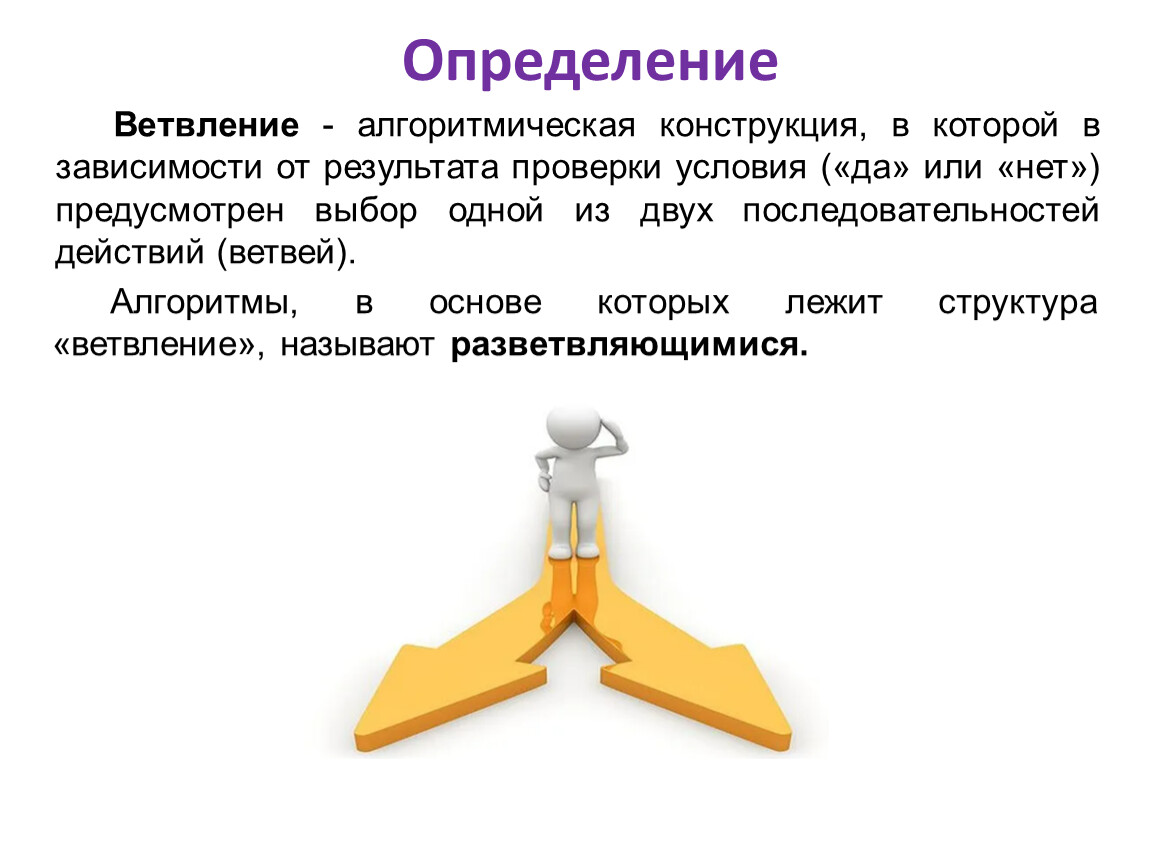 Ветвление - алгоритмическая конструкция, в которой в зависимости от результата проверки условия («да» или «нет») предусмотрен выбор одной из двух последовательностей действий (ветвей).