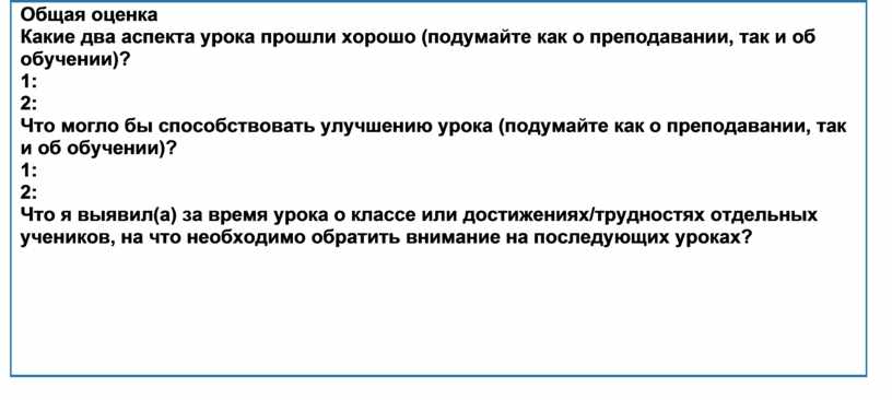 Общая оценка Какие два аспекта урока прошли хорошо (подумайте как о преподавании, так и об обучении)? 1: 2: Что могло бы способствовать улучшению урока (подумайте как о преподавании, так и об обучении)? 1: 2: Что я выявил(а) за время урока о классе или достижениях/трудностях отдельных учеников, на что необходимо обратить внимание на последующих уроках? |