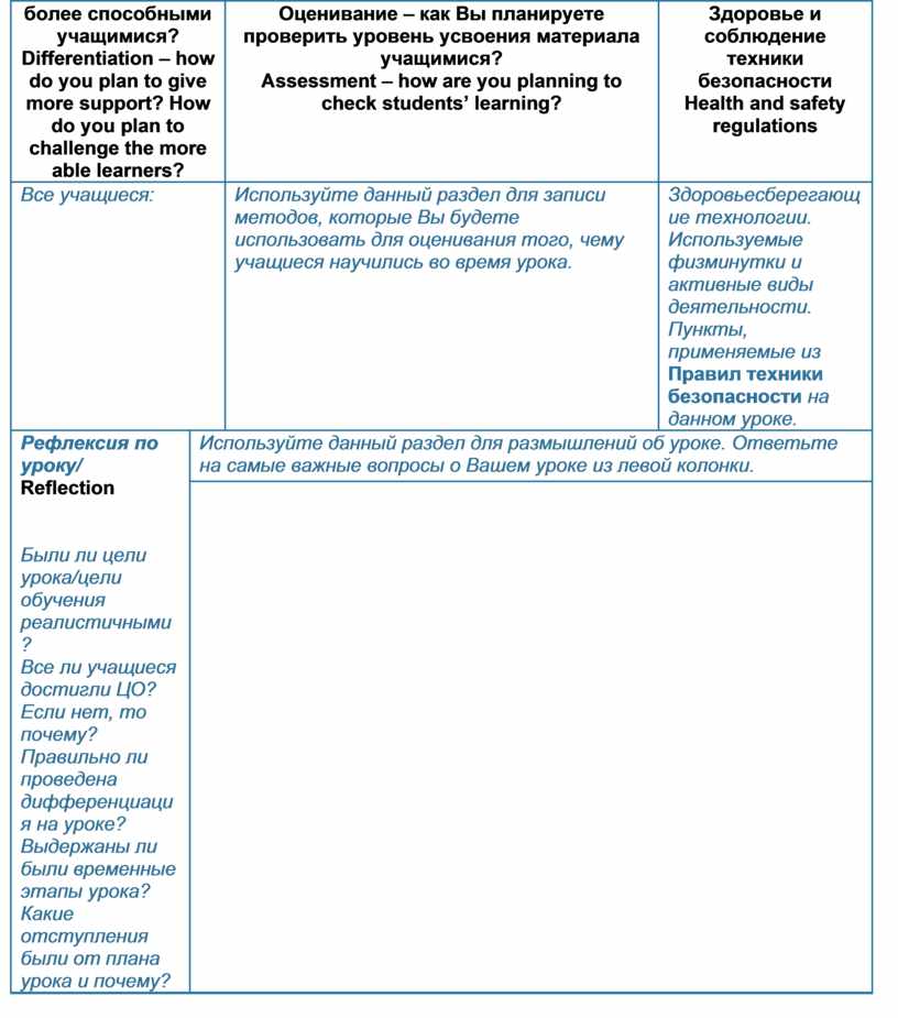 Были ли цели урока/цели обучения реалистичными? Все ли учащиеся достигли ЦО? Если нет, то почему? Правильно ли проведена дифференциация на уроке? Выдержаны ли были временные этапы урока? Какие отступления были от плана урока и почему? |