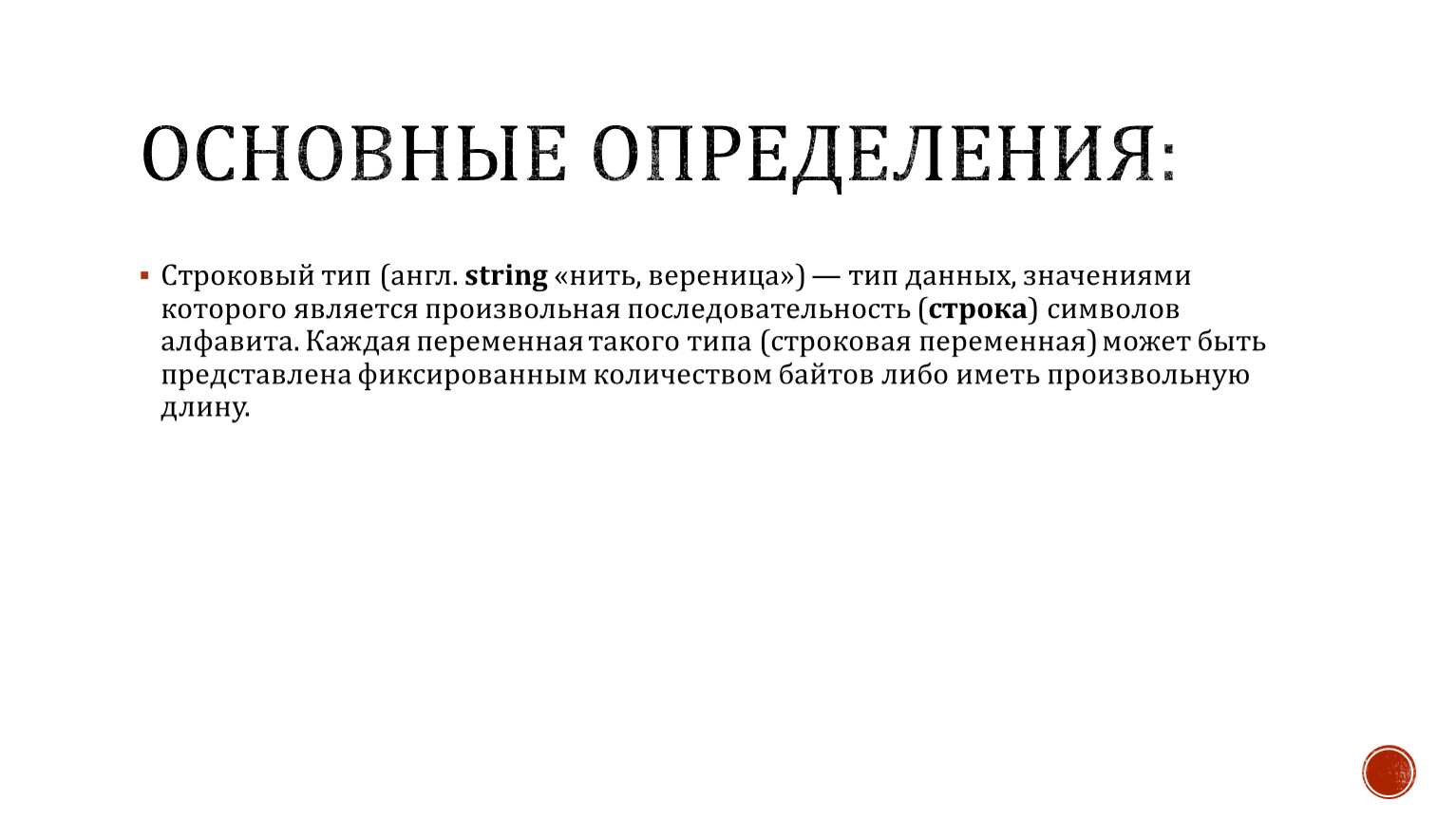 Строковый тип (англ. string «нить, вереница») — тип данных, значениями которого является произвольная последовательность (строка) символов алфавита. Каждая переменная такого типа (строковая переменная) может быть представлена фиксированным количеством байтов либо иметь произвольную длину.