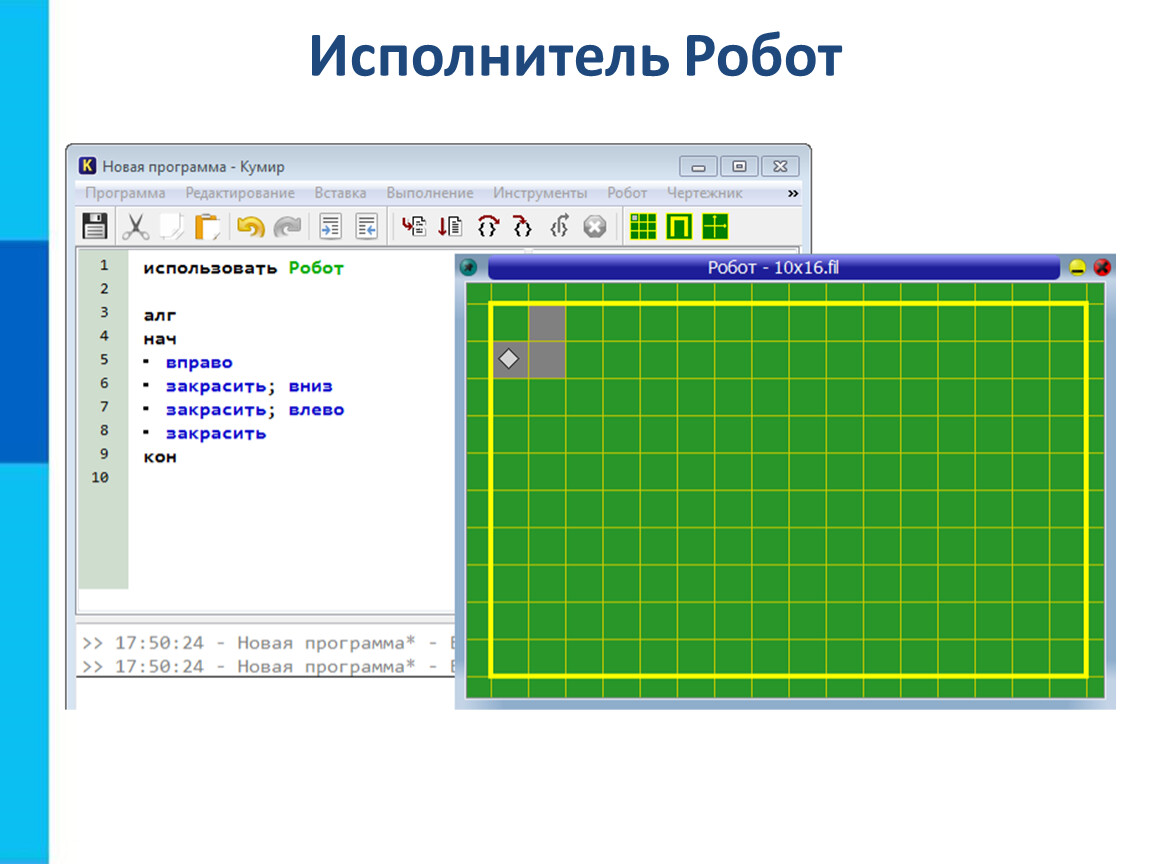 При выполнении каждой такой команды Робот перемещается в соседнюю клетку в указанном направлении. Если же в этом направлении между клетками стоит стена, то Робот разрушается.