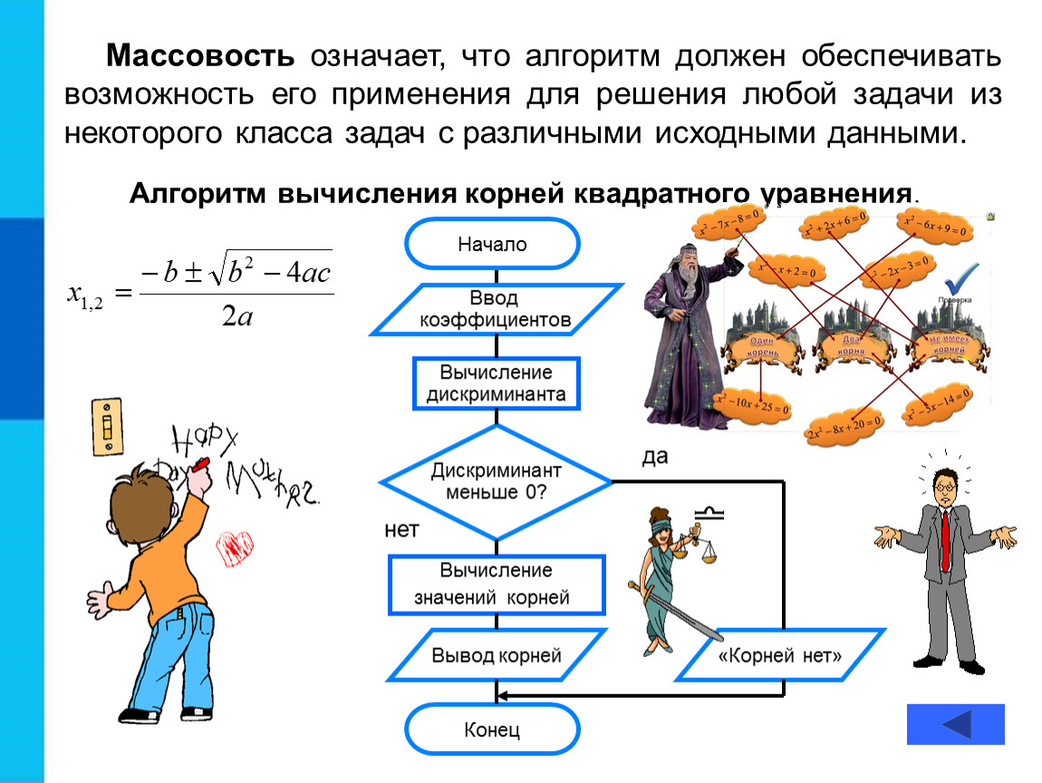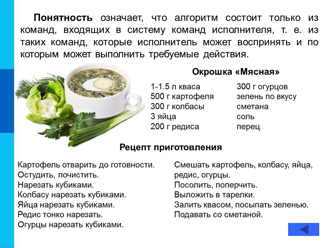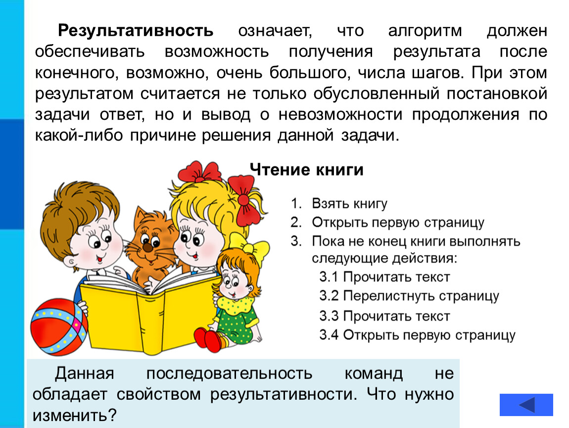Понятность означает, что алгоритм состоит только из команд, входящих в систему команд исполнителя, т. е. из таких команд, которые исполнитель может воспринять и по которым может выполнить требуемые действия.