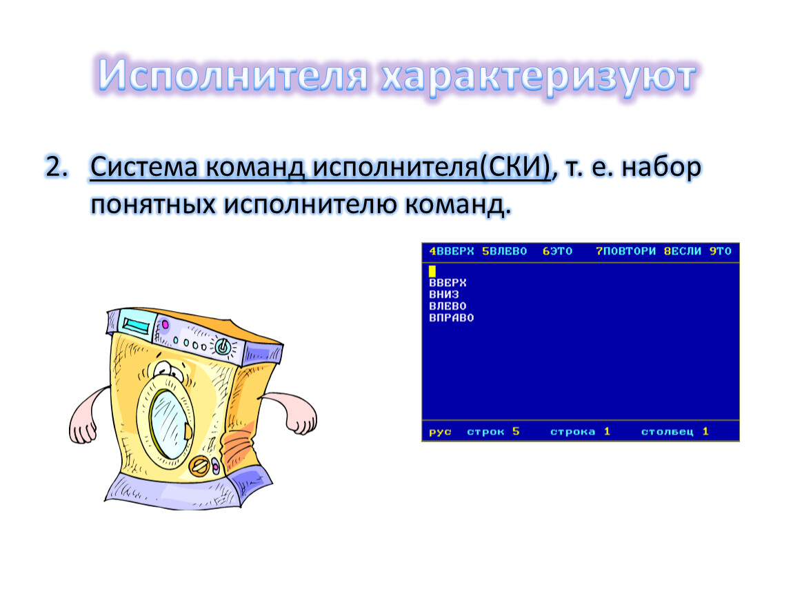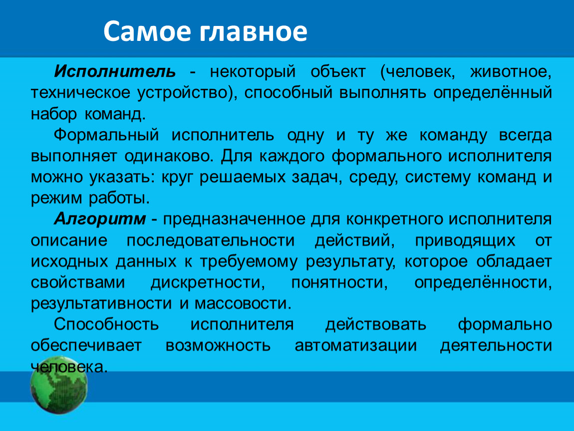 Исполнитель - это некоторый объект (человек, животное, техническое устройство), способный выполнять определённый набор команд.