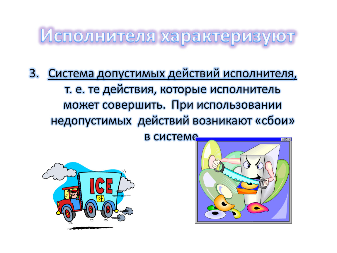 Система допустимых действий исполнителя, т. е. те действия, которые исполнитель может совершить. При использовании недопустимых действий возникают «сбои» в системе.