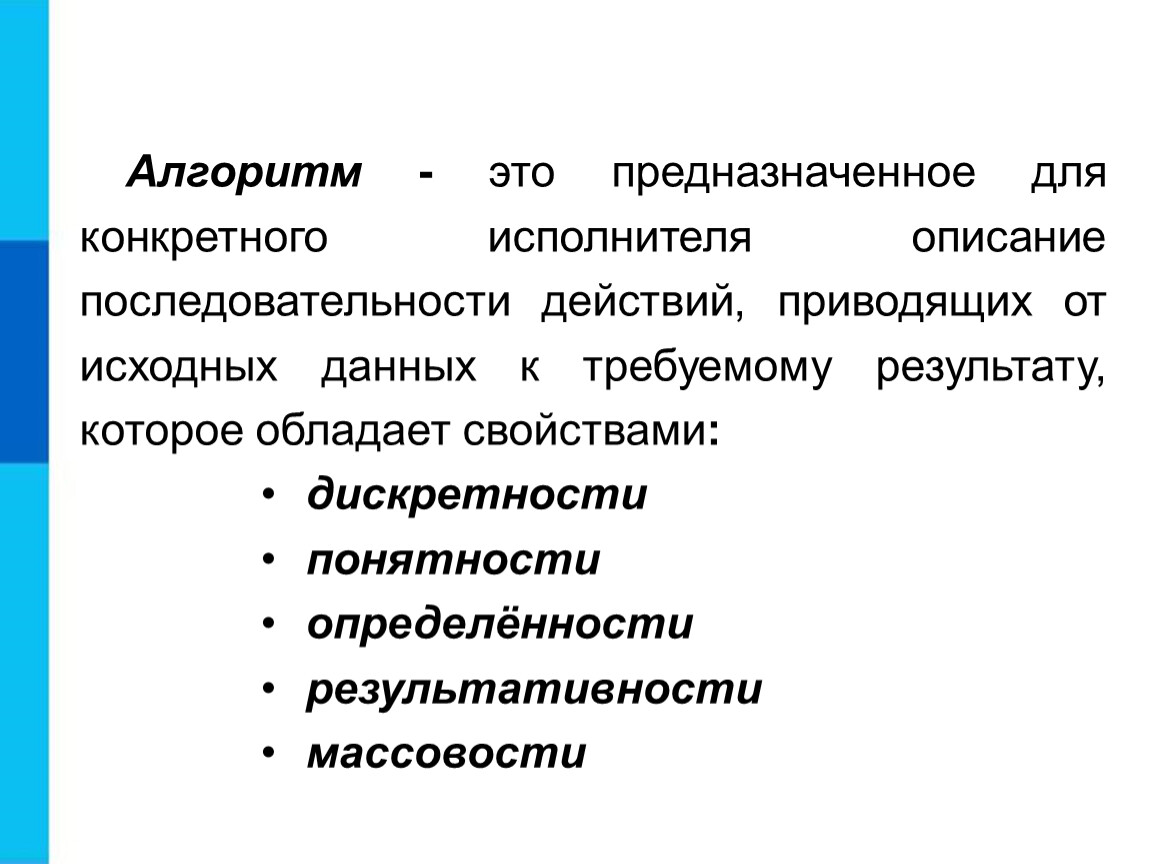 Алгоритм - это предназначенное для конкретного исполнителя описание последовательности действий, приводящих от исходных данных к требуемому результату, которое обладает свойствами дискретности, понятности, определённости, результативности и массовости.