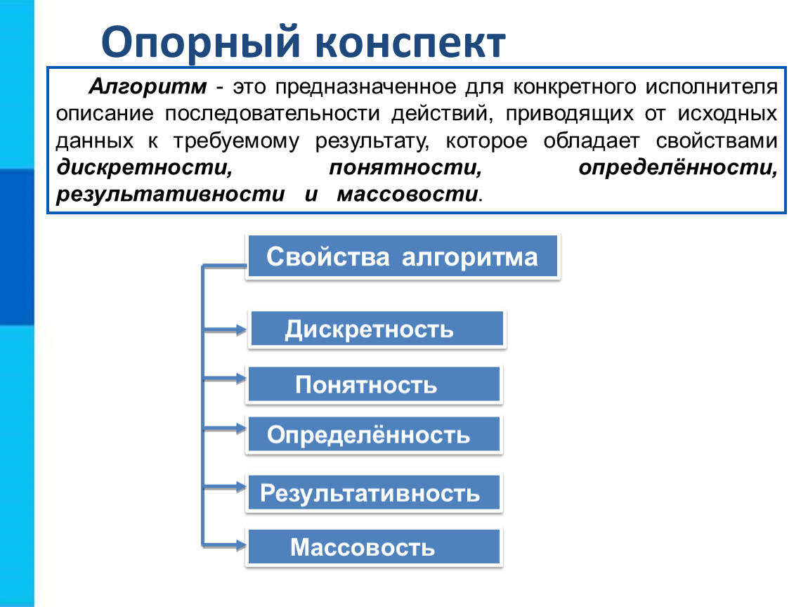 Алгоритм - предназначенное для конкретного исполнителя описание последовательности действий, приводящих от исходных данных к требуемому результату, которое обладает свойствами дискретности, понятности, определённости, результативности и массовости.
