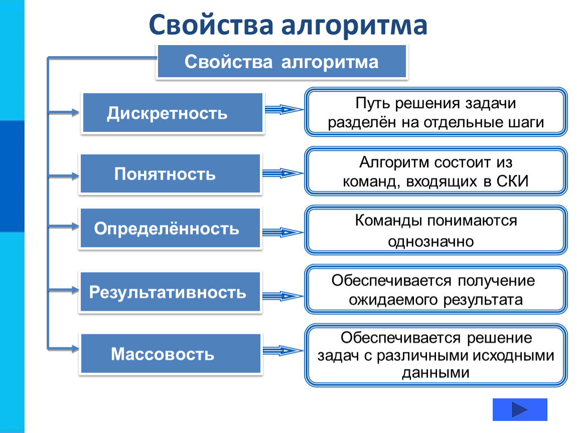 определённости - каждая команда трактуется и выполняется исполнителем однозначно; имеются указания об очерёдности выполнения команд;