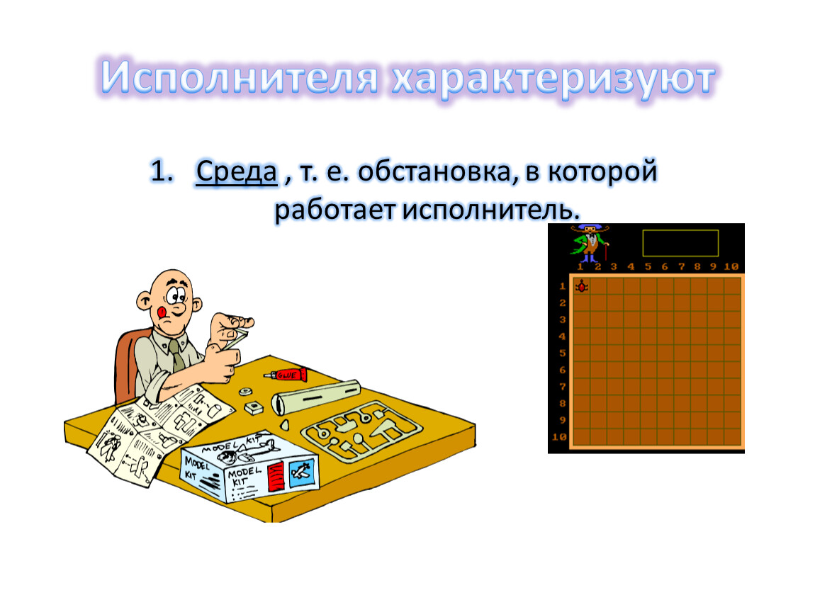 Исполнитель - некоторый объект (человек, животное, техническое устройство), способный выполнять определённый набор команд.