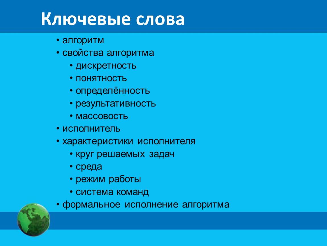 Формальный исполнитель одну и ту же команду всегда выполняет одинаково. Для каждого формального исполнителя можно указать: круг решаемых задач, среду, систему команд и режим работы.