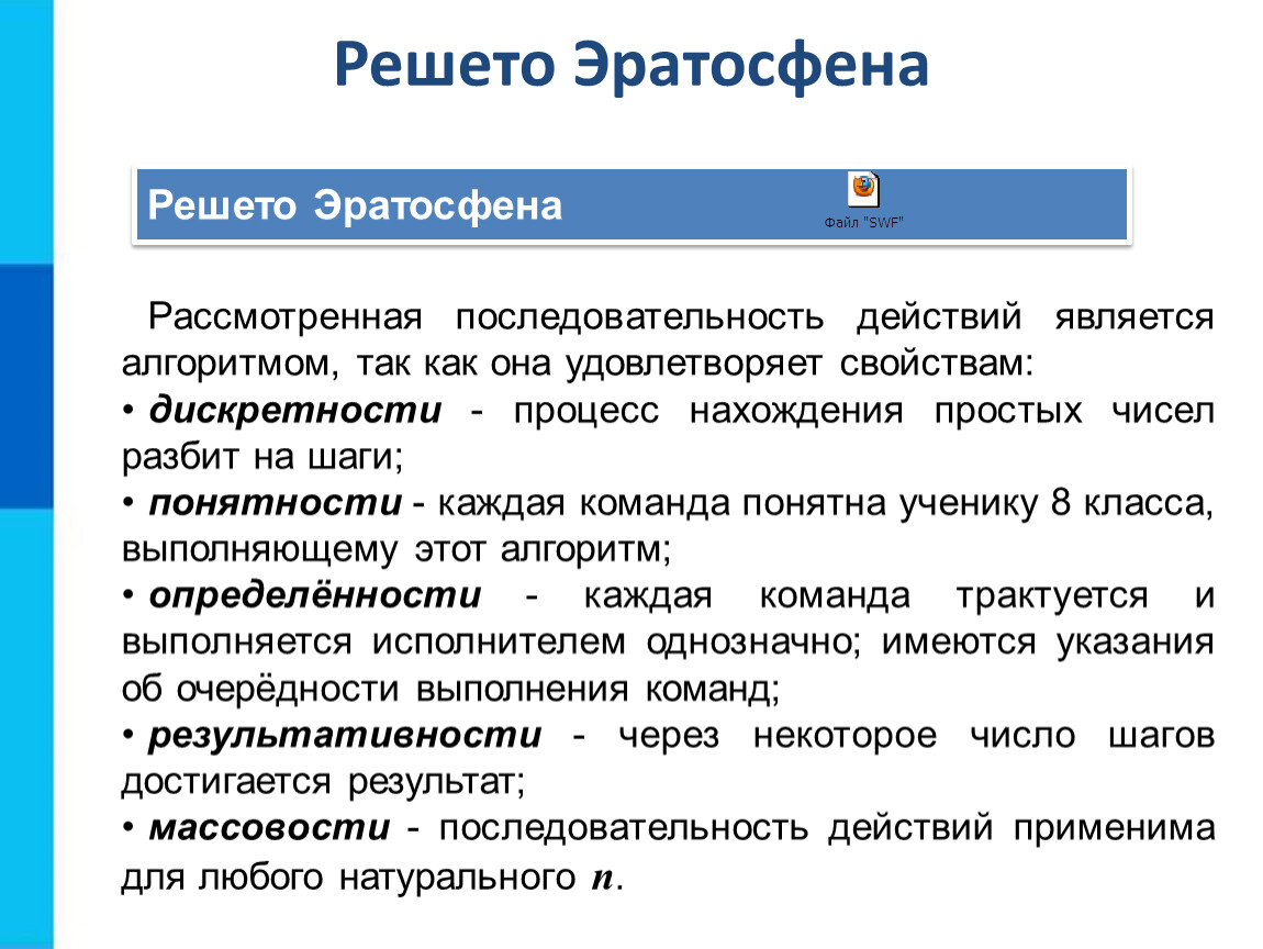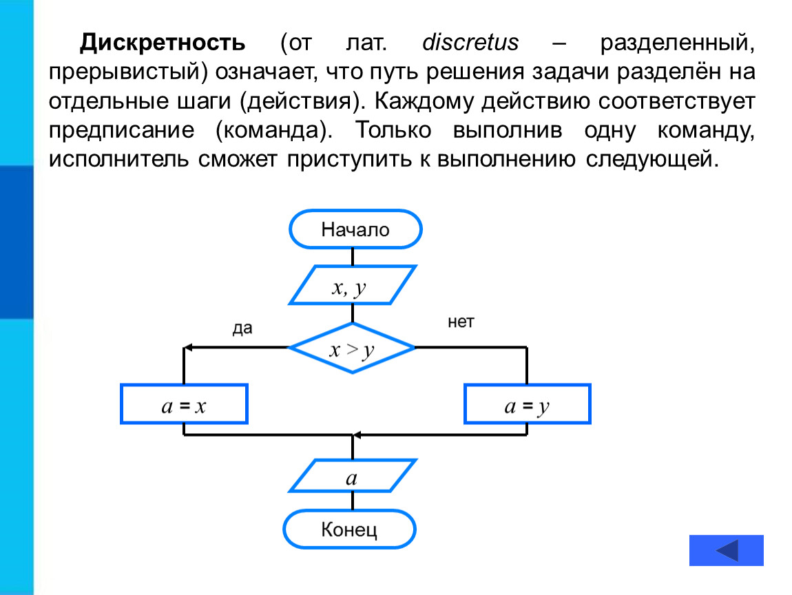 Дискретность (от лат. discretus – разделенный, прерывистый) означает, что путь решения задачи разделён на отдельные шаги (действия). Каждому действию соответствует предписание (команда). Только выполнив одну команду, исполнитель сможет приступить к выполнению следующей.
