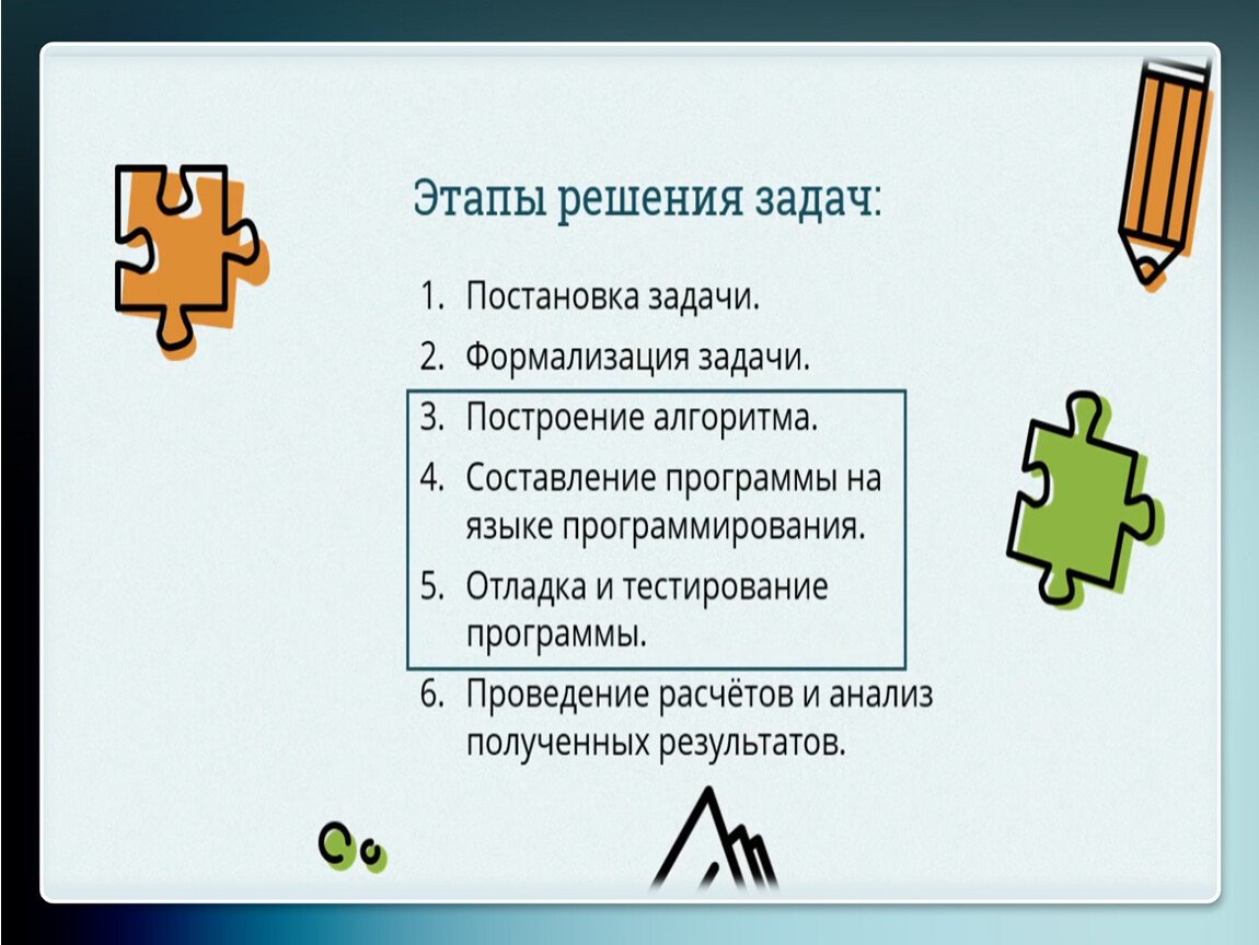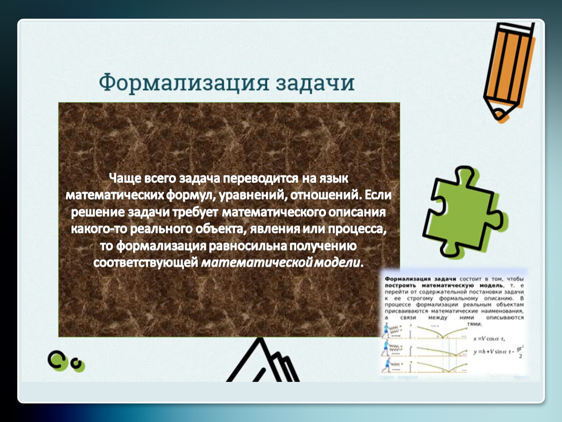 Чаще всего задача переводится на язык математических формул, уравнений, отношений. Если решение задачи требует математического описания какого-то реального объекта, явления или процесса, то формализация равносильна получению соответствующей математической модели.
