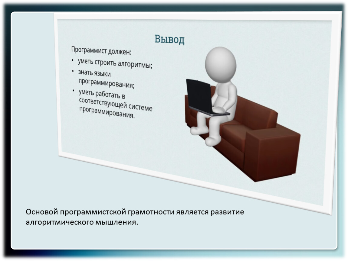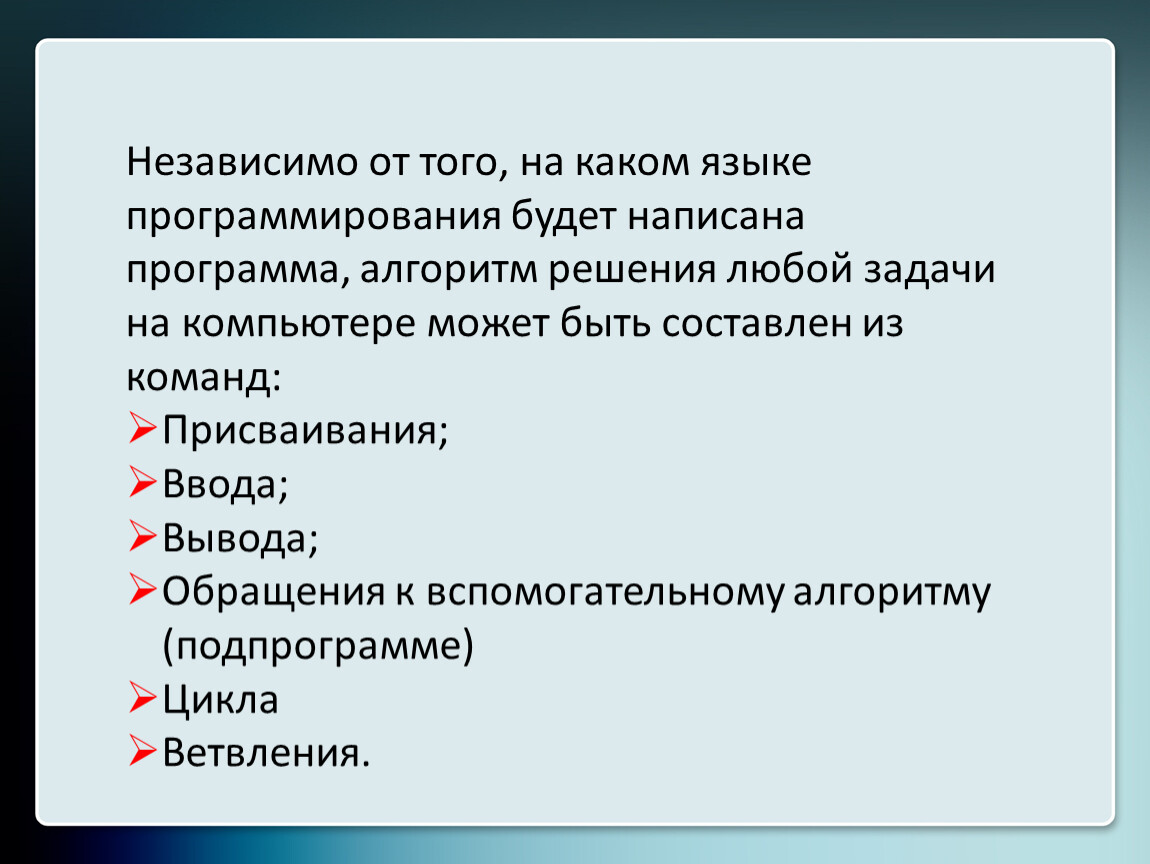 Независимо от того, на каком языке программирования будет написана программа, алгоритм решения любой задачи на компьютере может быть составлен из команд: