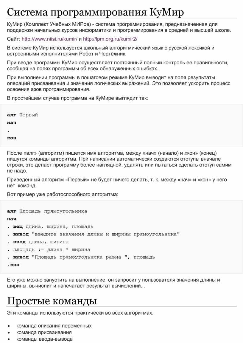 КуМир (Комплект Учебных МИРов) - система программирования, предназначенная для поддержки начальных курсов информатики и программирования в средней и высшей школе.
