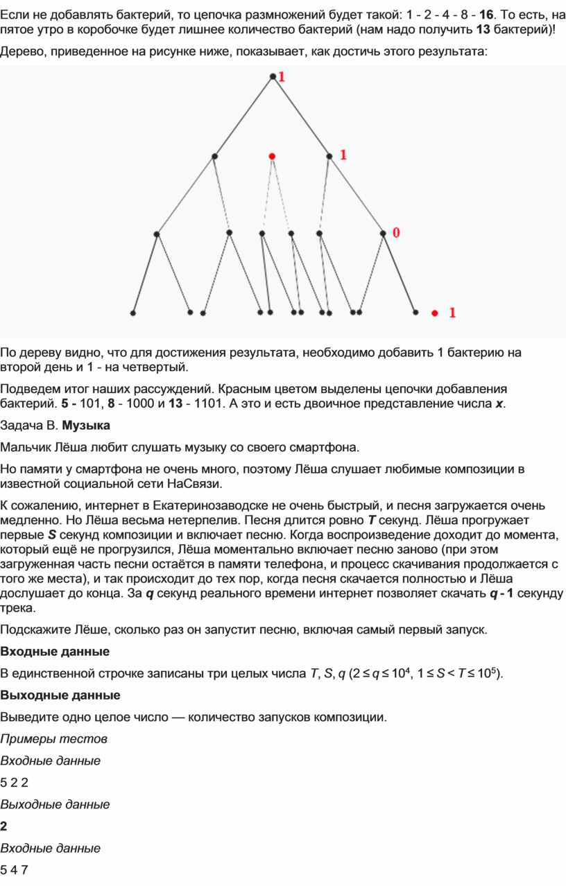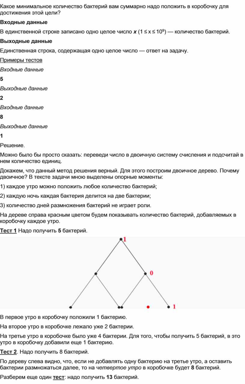Подведем итог наших рассуждений. Красным цветом выделены цепочки добавления бактерий. 5 - 101, 8 - 1000 и 13 - 1101. А это и есть двоичное представление числа x.