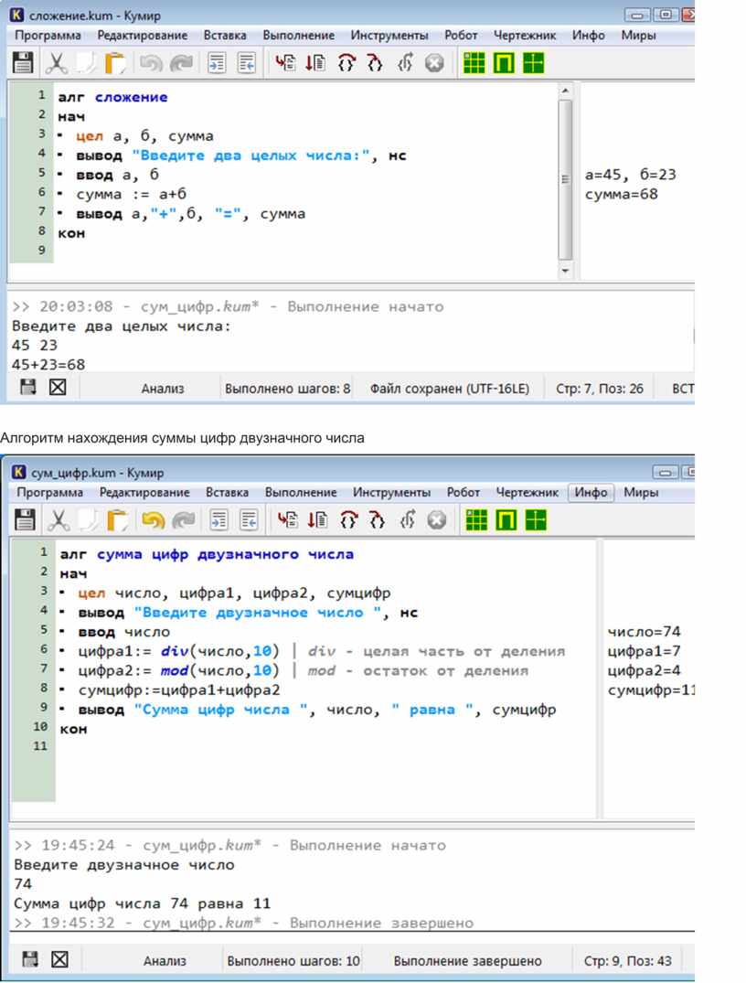 При выполнении программы в пошаговом режиме КуМир выводит на поля результаты операций присваивания и значения логических выражений. Это позволяет ускорить процесс освоения азов программирования.