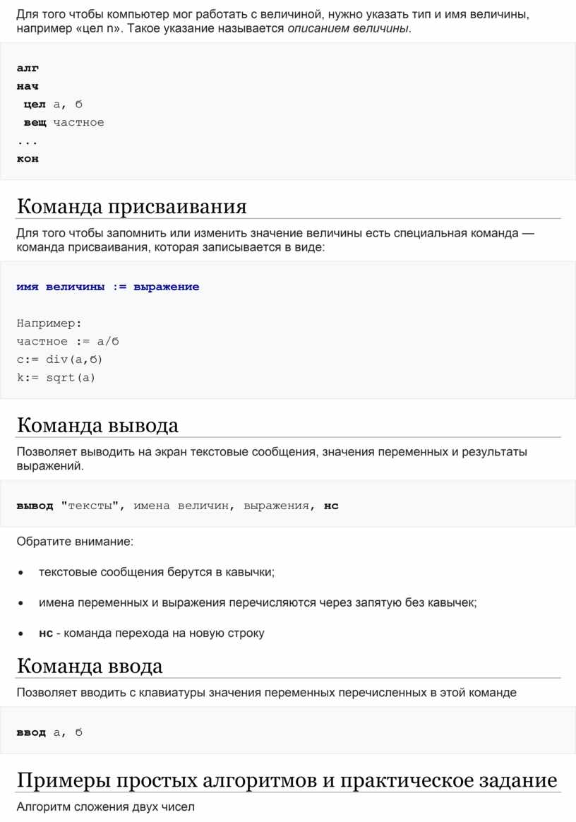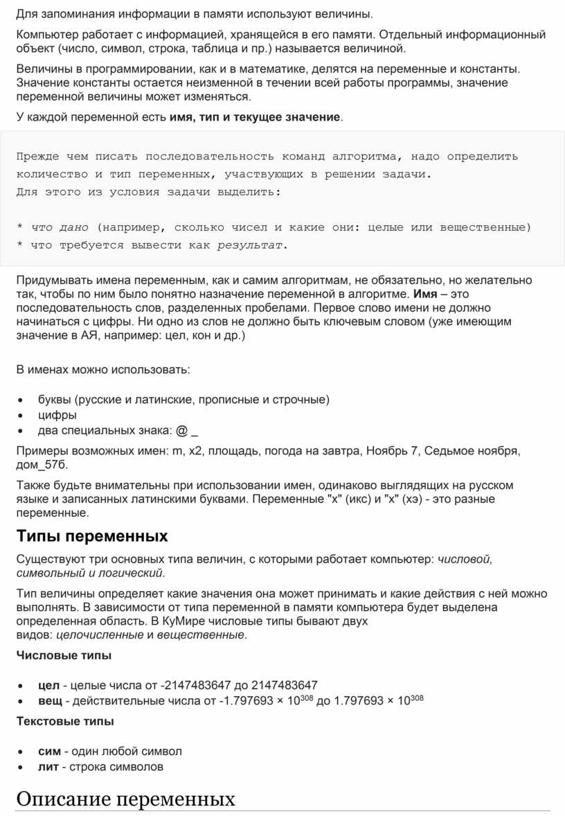 Для того чтобы компьютер мог работать с величиной, нужно указать тип и имя величины, например «цел n». Такое указание называется описанием величины.