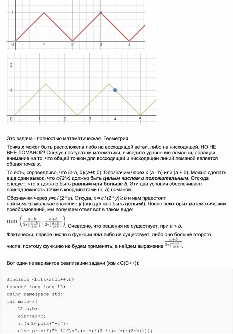 То есть, справедливо, что (a-b, 0)/(a+b,0). Обозначим через с (a - b) или (a + b). Можно сделать еще один вывод, что с/(2*x) должно быть целым числом и положительным. Отсюда следует, что x должно быть равным или больше b. Эти два условия обеспечивают принадлежность точки с координатами (a, b) ломаной.