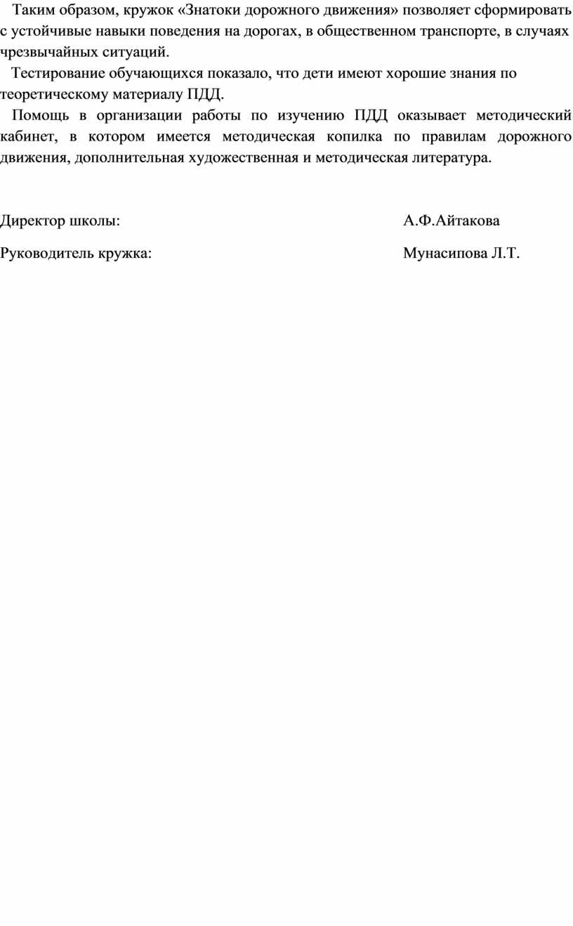 Таким образом, кружок «Знатоки дорожного движения» позволяет сформировать с устойчивые навыки поведения на дорогах, в общественном транспорте, в случаях чрезвычайных ситуаций.