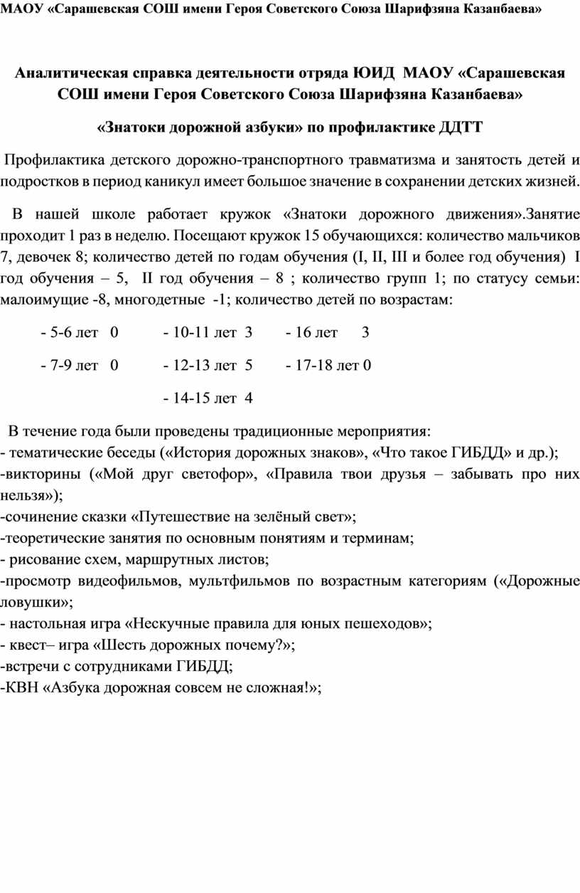 Аналитическая справка деятельности отряда ЮИД МАОУ «Сарашевская СОШ имени Героя Советского Союза Шарифзяна Казанбаева»