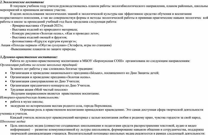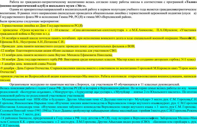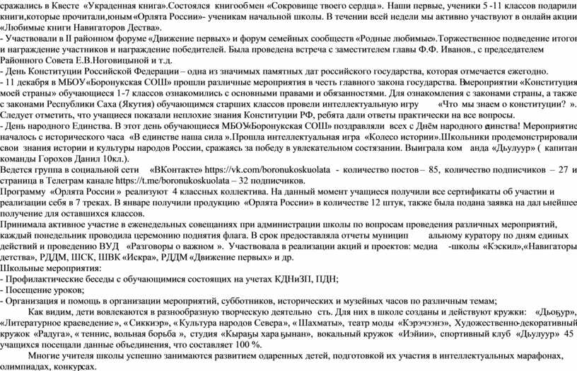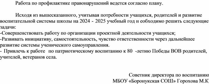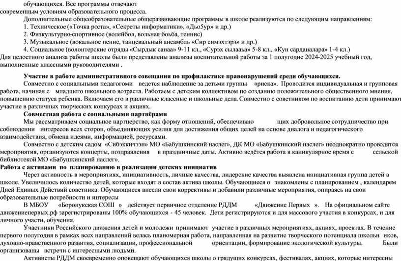Деятельность советника директора по воспитанию и взаимодействию с детскими общественными объединениями, Гороховой Мирославы Константиновны, строилась в соответствии с календарным планом воспитательной работы МБОУ «Боронукская СОШ» и планом работы советника. Работа советника директора по воспитанию в нашей школе органично вплетена в воспитательную работу школы, то есть на общешкольном уровне происходит единая работа и заместителя директора по учебно-воспитательной работе, и классного руководителя, и педагога-организатора детского движения, и вожатых, и советника по воспитанию. Советник Боронукской школы а также является председателем первичного отделения РДДМ «Движение Первых», руководителем ДОО «Аар болох».
