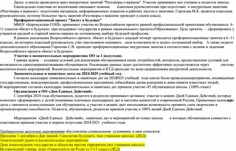 Мероприятия «Дней Единых Действий», памятных дат и мероприятий по плану школы в которых обучающиеся совместно с советником приняли участие в первом полугодии 2024-2025 учебного года: