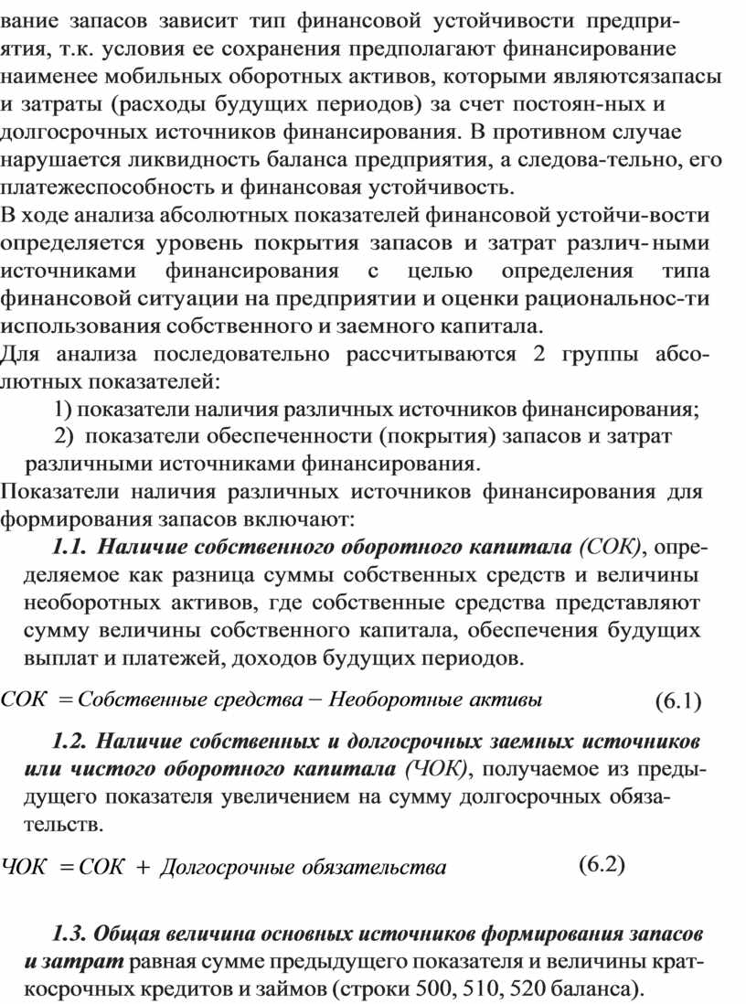1.2. Наличие собственных и долгосрочных заемных источников или чистого оборотного капитала (ЧОК), получаемое из преды- дущего показателя увеличением на сумму долгосрочных обяза- тельств.