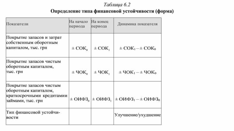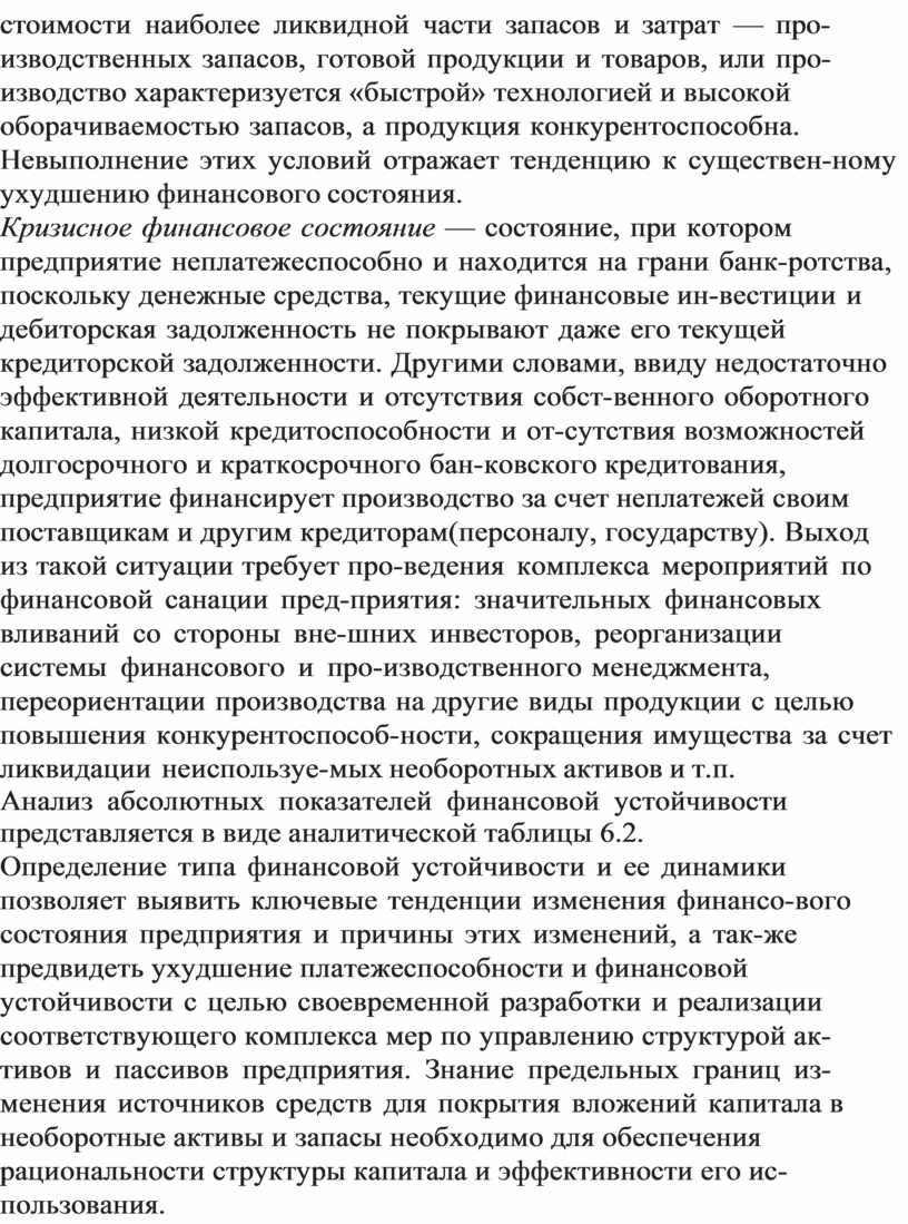 Определение типа финансовой устойчивости и ее динамики позволяет выявить ключевые тенденции изменения финансо- вого состояния предприятия и причины этих изменений, а так- же предвидеть ухудшение платежеспособности и финансовой устойчивости с целью своевременной разработки и реализации соответствующего комплекса мер по управлению структурой ак- тивов и пассивов предприятия. Знание предельных границ из- менения источников средств для покрытия вложений капитала в необоротные активы и запасы необходимо для обеспечения рациональности структуры капитала и эффективности его ис- пользования.