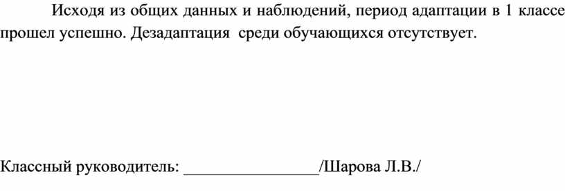 Подводя итоги адаптационного периода, следует отметить, что с родителями проводилось анкетирование по выявлению уровня адаптации. Исходя из общих данных и наблюдений, период адаптации в 1 классе прошел успешно. Дезадаптация среди обучающихся отсутствует.