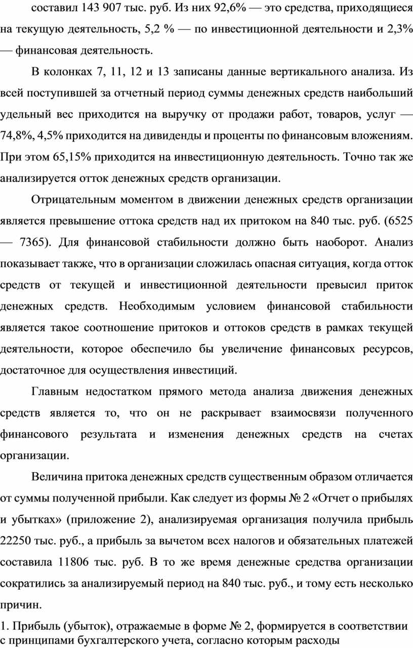 В колонках 8, 9, 10 записаны показатели горизонтального анализа. Сумма поступивших денежных средств составила 143 067 тыс. руб. Из них 83,8% приходится на текущую деятельность, 1,5% — на инвестиционную и 14,7% — на финансовую. Отток денежных средств организации в отчетном периоде составил 143 907 тыс. руб. Из них 92,6% — это средства, приходящиеся на текущую деятельность, 5,2 % — по инвестиционной деятельности и 2,3% — финансовая деятельность.