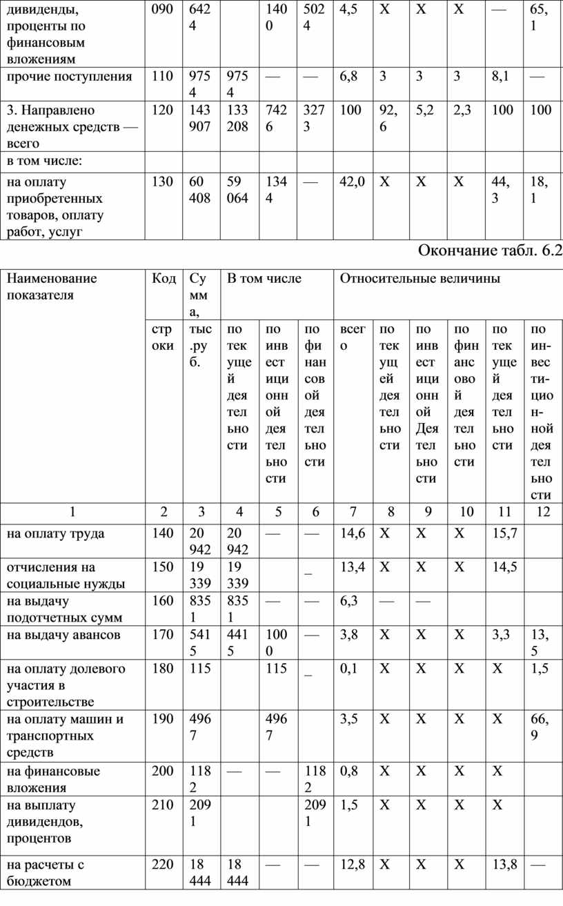 В колонках 7, 11, 12 и 13 записаны данные вертикального анализа. Из всей поступившей за отчетный период суммы денежных средств наибольший удельный вес приходится на выручку от продажи работ, товаров, услуг — 74,8%, 4,5% приходится на дивиденды и проценты по финансовым вложениям. При этом 65,15% приходится на инвестиционную деятельность. Точно так же анализируется отток денежных средств организации.