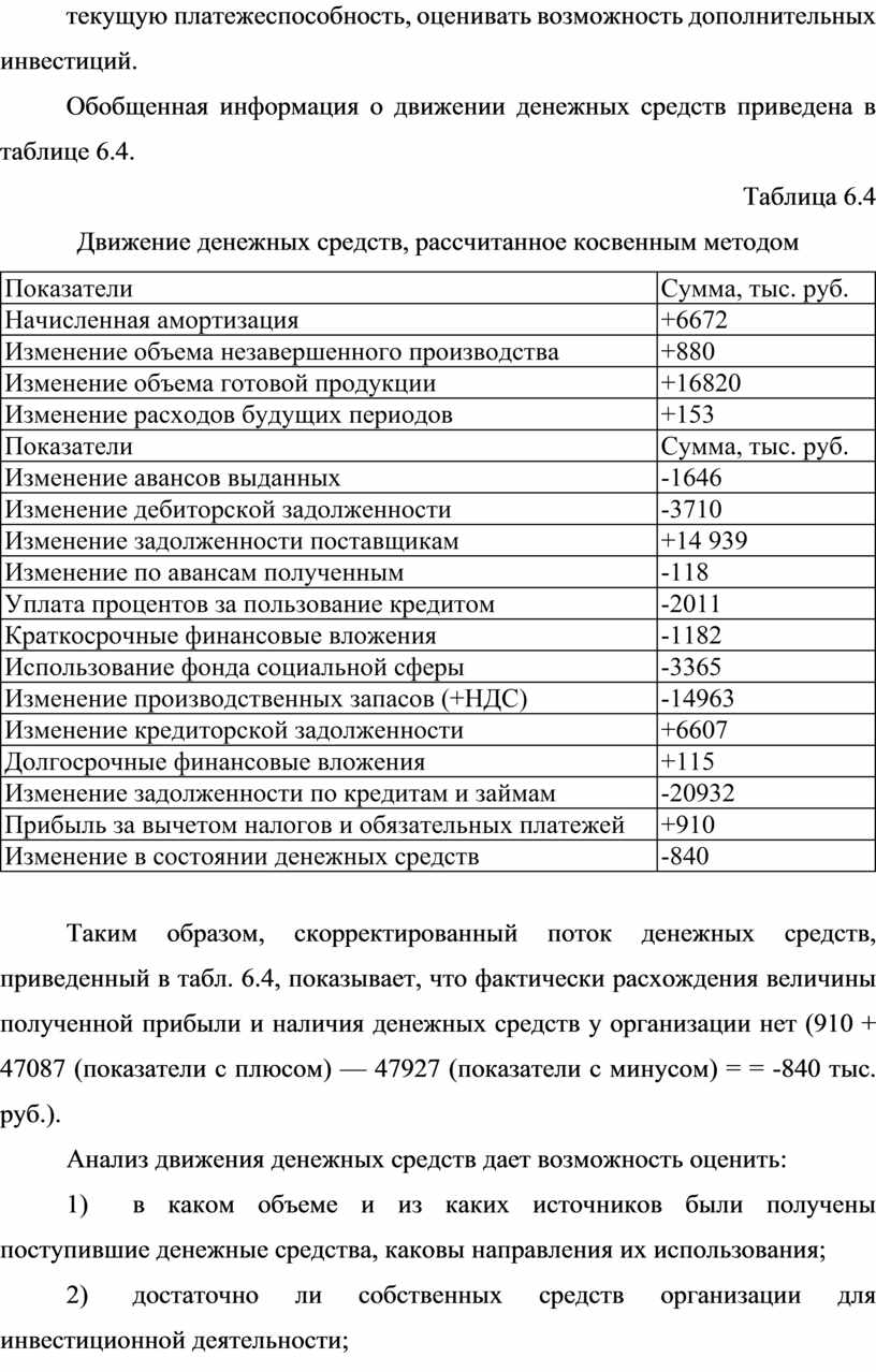 Обобщенная информация о движении денежных средств приведена в таблице 6.4.